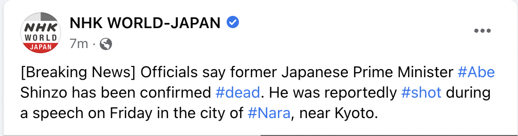 យោងតាមការផ្សាយព័ត៌មានចុងក្រោយបង្អស់ពីទីភ្នាក់ងារសារព័ត៌មានជប៉ុន NHK នារសៀលថ្ងៃទី០៨ ខែកក្កដា ឆ្នាំ២០២២ នេះ បានឲ្យដឹងថា អតីតនាយករដ្ឋមន្ត្រីជប៉ុនលោក Shinzo Abe បានទទួលមរណភាពហើយក្នុងវ័យ ៦៧ឆ្នាំ ក្រោយរងការបាញ់ប្រហារពីសំណាក់ខ្មាន់កាំភ្លើង។
