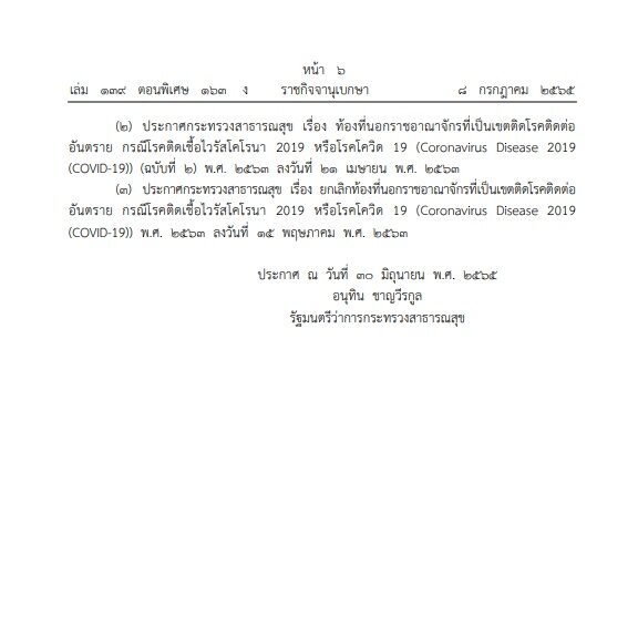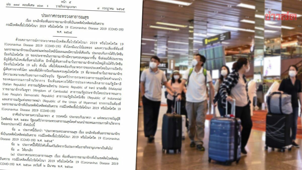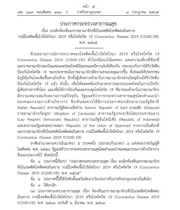 ថៃ៖ កាលពីថ្ងៃទី០៩ ខែកក្កដា ឆ្នាំ២០២២ រដ្ឋាភិបាលថៃបានចេញផ្សាយសេចក្តីប្រកាសរបស់ក្រសួងសុខាភិបាលស្តីពីការលុបចោលតំបន់នៅក្រៅប្រទេសថៃ ដែលមានជំងឺឆ្លងដ៏គ្រោះថ្នាក់ក្នុងករណីជំងឺកូវីដ-១៩ ឆ្នាំ២០២២ ដែលចុះហត្ថលេខាដោយ លោក Anutin Charnvirakul រដ្ឋមន្ត្រីក្រសួងសុខាភិបាល។ សេចក្តីប្រកាសបានបញ្ជាក់ថា «ជាមួយនឹងស្ថានភាពរាតត្បាតនៃជំងឺកូវីដ-១៩ នៅជុំវិញពិភពលោក មាននិន្នាការថយចុះ និងហានិភ័យនៅក្រៅប្រទេស និងជាប្រភពនៃការរីករាលដាលនៃជំងឺនេះមានចំនួនថយចុះ ឬប្រហាក់ប្រហែលគ្នា។ ចំណែកប្រជាជនថៃនៅក្រៅប្រទេសទទួលបានវ៉ាក់សាំងប្រឆាំងជំងឺកូវីដ-១៩ ហើយប្រជាជនថៃនៅក្នុងប្រទេសក៏មានប្រព័ន្ធភាពសុំាប្រឆាំងនឹងមេរោគកូវីដ-១៩ កើនឡើងផងដែរ។ លើសពីនេះទៅទៀត អ្នកធ្វើដំណើរចូលមកថៃភាគច្រើនត្រូវបានចាក់វ៉ាក់សាំងការពារជំងឺកូវីដ-១៩ រួចជាស្រេចទៀតនោះ។