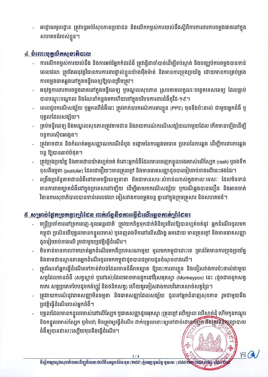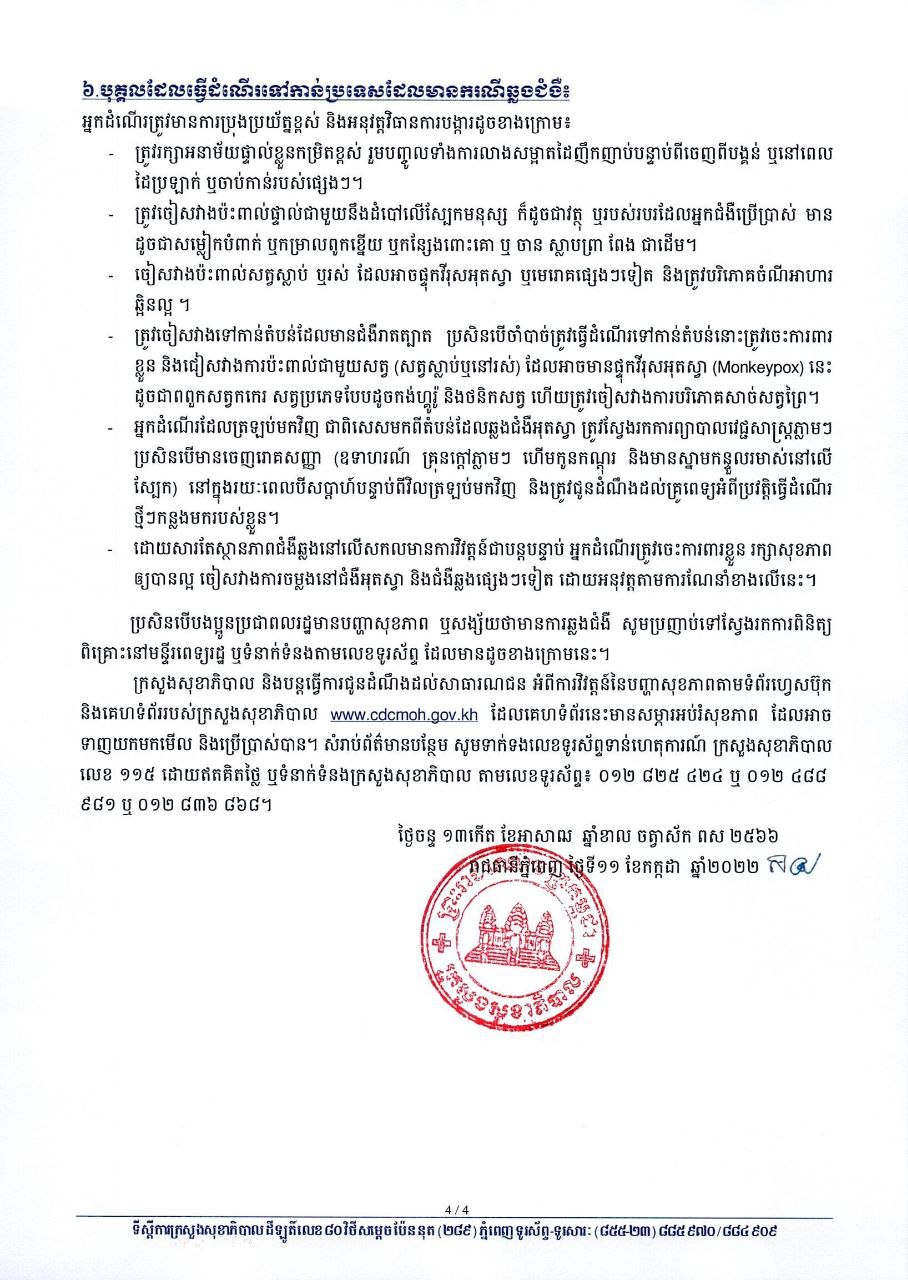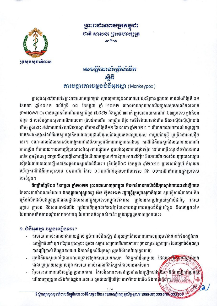 រាជធានីភ្នំពេញ៖ យោងតាមការចុះផ្សាយរបស់ ក្រសួងសុខាភិបាល នៅថ្ងៃទី១១ ខែកក្កដា ឆ្នាំ២០២២ បានចេញសេចក្ដីណែនាំក្រើនរំលឹក ស្ដីពីការបង្ការការចម្លងជំងឺអុតស្វា(Monkeypox) ។