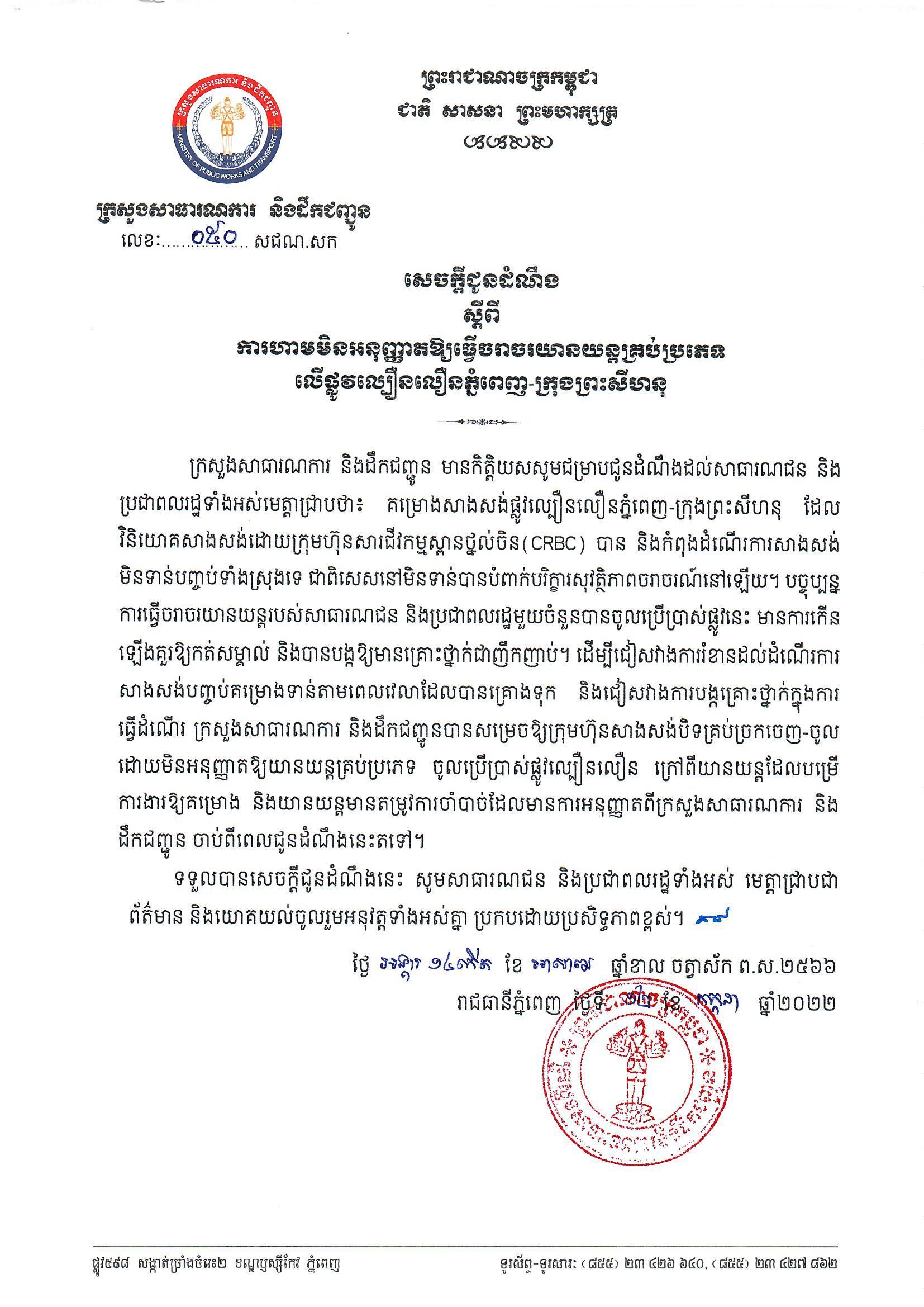 ក្រសួងសាធារណការ និងដឹកជញ្ជូន សូមជម្រាបជូនដំណឹងសាធារណជន និងប្រជាពលរដ្ឋទាំងមេត្តាជ្រាបថា៖ គម្រោងសាងសង់ផ្លូវល្បឿនលឿនភ្នំពេញ-ក្រុងព្រះសីហនុ ដែលវិនិយោគសាងសង់ដោយក្រុមហ៊ុនសារជីវកម្មស្ពានថ្នល់ចិន(CRBC) បាន និងកំពុងដំណើរការសាងសង់មិនទាន់បញ្ចប់ទាំងស្រុងទេ ជាពិសេសនៅមិនទាន់បានបំពាក់បរិក្ខារសុវត្ថិភាពចរាចរណ៍នៅឡើយ។ បច្ចុប្បន្នការធ្វើចរាចរយានយន្តរបស់សាធារណជន និងប្រជាពលរដ្ឋមួយចំនួនបានចូលប្រើប្រាស់ផ្លូវនេះ មានការកើនឡើងគួរឱ្យកត់សម្គាល់ និងបានបង្កឱ្យគ្រោះថ្នាក់ជាញឹកញាប់។