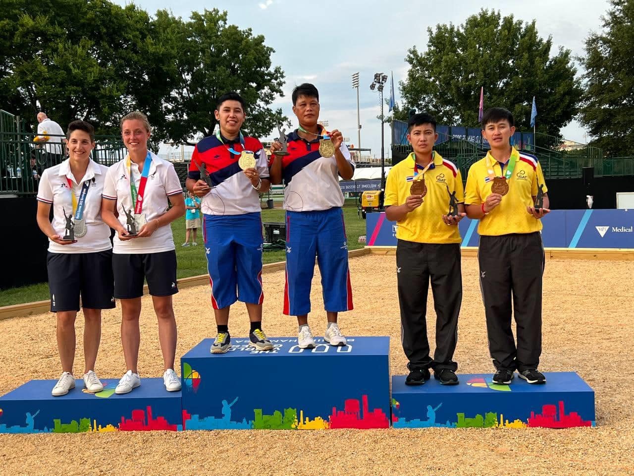 យោងតាមការចុះផ្សាយរបស់ ទូរទស្សន៍ជាតិកម្ពុជា ទទក នៅថ្ងៃទី១៤ ខែកក្កដា ឆ្នាំ២០២២ បានឲ្យដឹងថា ក្រុមកីឡាការិនី ប៉េតង់ ជម្រើសជាតិកម្ពុជា រួមមានកីឡាការិនី អ៊ុក ស្រីមុំ និង អ៊ុន ស្រីយ៉ា បានឈ្នះមេដាយមាស ១គ្រឿងបន្ថែមទៀត ពីព្រឹត្តិការណ៍កីឡាពិភពលោក The World Games 2022 នៅទីក្រុង Birmingham រដ្ឋ Alabama សហរដ្ឋអាមេរិក បន្ទាប់ពីយកឈ្នះ ក្រុមកីឡាការិនី បារាំង Nadege BAUSSIAN និង Caroline Marie BOURRIAUD ដោយពិន្ទុ ៧-៥ លើវិញ្ញាសាវាយគូ ២នាក់ ទល់ ២នាក់ នៅវគ្គផ្ដាច់ព្រ័ត្រ នៅព្រឹកថ្ងៃទី១៤ ខែកក្កដា ឆ្នាំ២០២២ នេះ (ម៉ោងនៅកម្ពុជា)។