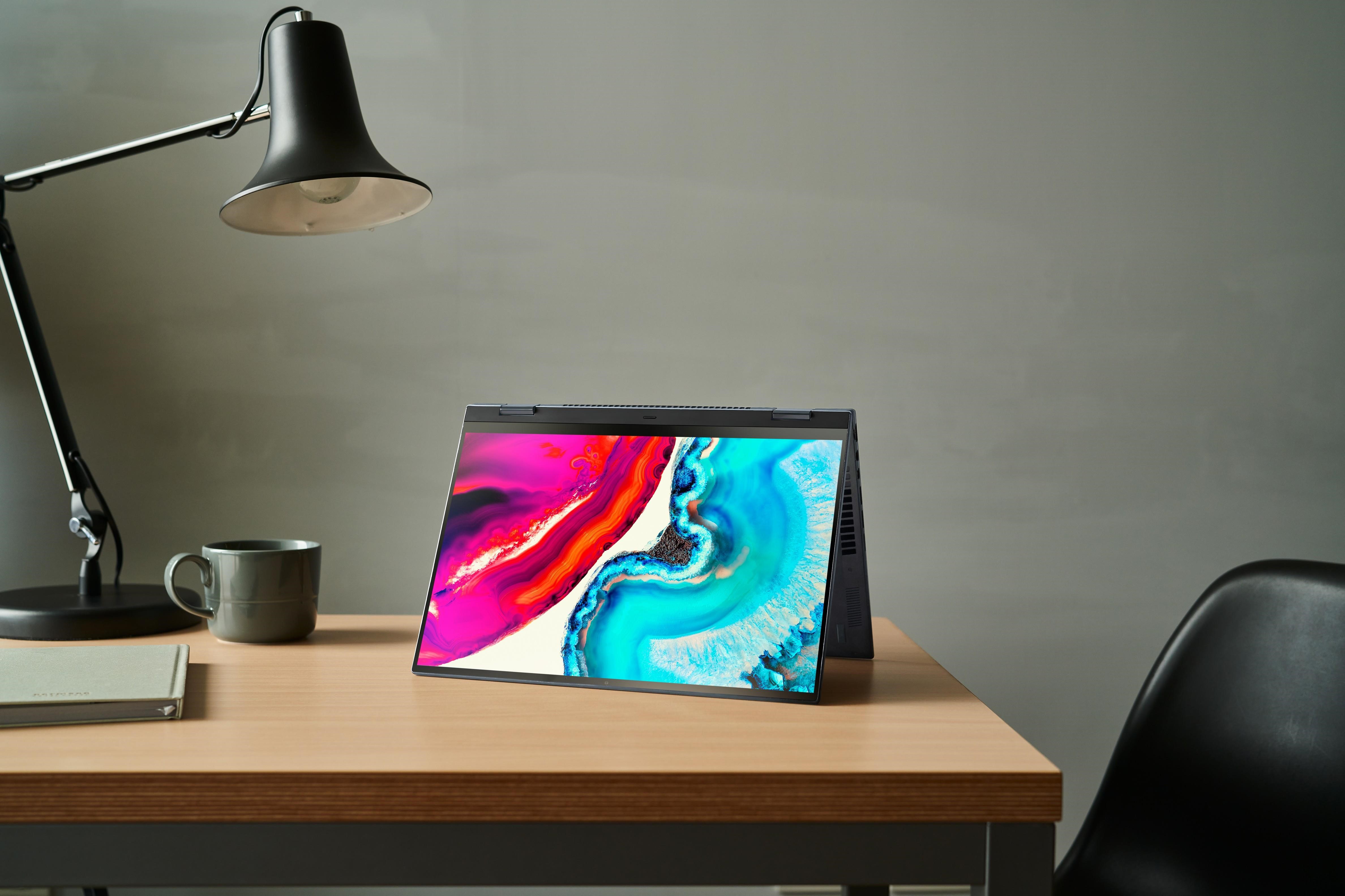 Zenbook 14 Flip OLED បំពាក់នូវអេក្រង់ ultra-bright up to 4K OLED HDR NanoEdge touchscreen ភ្លឺខ្លាំង ដែលផ្ដល់នៅរូបភាពច្បាស់ល្អ ពិសេសជាមួយនឹងរូបភាព ឬ ពណ៌ខ្មៅក្រឹប និងសមាមាត្រកម្រិតពណ៌ 1,000,000 ទៅ 1 ។ ជាមួយគ្នានេះ អេក្រង់ត្រូវបានទទួលស្គាល់ដោយ PANTONE® Validated សម្រាប់ភាពត្រឹមត្រូវនៃពណ៌ស្តង់ដារឧស្សាហកម្ម ជាមួយនឹងកម្រិតពណ៌ 100% DCI-P3 gamut កម្រិតភាពយន្ត ដែលផ្ដល់នូវរូបភាពភ្លឺច្បាស់ និងត្រូវបានទទួលស្គាល់ដោយ TÜV សម្រាប់កម្រិតពន្លឺពណ៌ខៀវទាប។ ក្រៅពីនេះ aspect ratio 16:10 ថ្មី ជាមួយនឹង សមាមាត្រអេក្រង់ទៅតួខ្លួន 88% របស់កុំព្យូទ័រស៊េរីថ្មីនេះ ផ្តល់នូវទំហំការងារកាន់តែធំជាងមុន ដោយកាត់បន្ថយតម្រូវការសម្រាប់ការអូសចុះអូសឡើង។