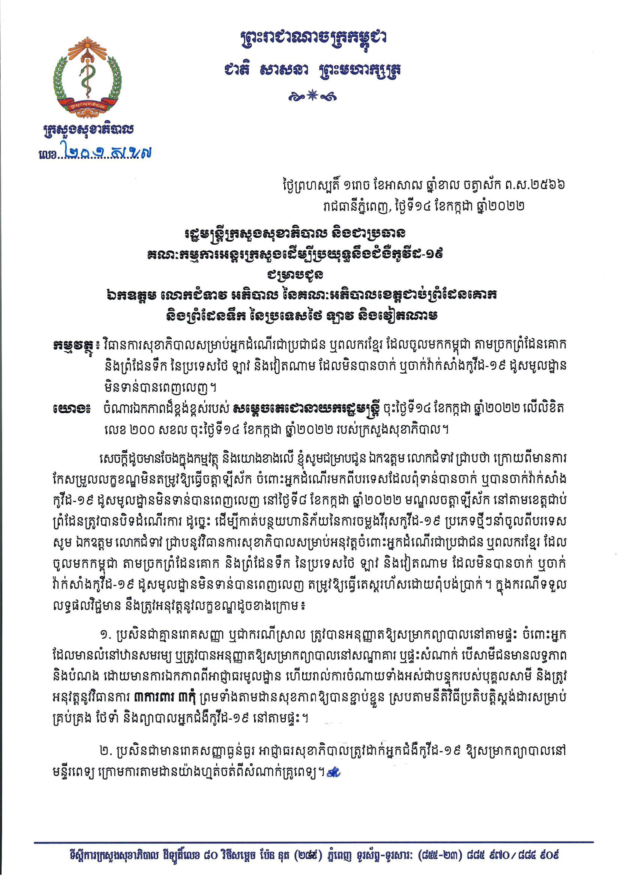 រាជធានីភ្នំពេញ៖ យោងតាមការចុះផ្សាយរបស់ ក្រសួងសុខាភិបាល នៅថ្ងៃទី១៥ ខែកក្កដា ឆ្នាំ២០២២ បានចេញជូនដំណឹង ស្ដីពីវិធានការសុខាភិបាលសម្រាប់អ្នកដំណើរប្រជាជន ឬពលករខ្មែរ- ដែលចូលមកកម្ពុជា តាមច្រកព្រំដែនគោក និងព្រំដែនទឹក នៃប្រទេសថៃ ឡាវ និងវៀតណាម ដែលមិនបានចាក់ ឬចាក់វ៉ាក់សាំងកូវីដ-១៩ ដូសមូលដ្ឋានមិនទាន់បានពេញលេញ។