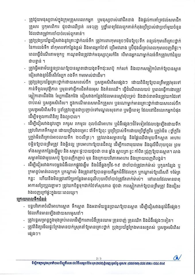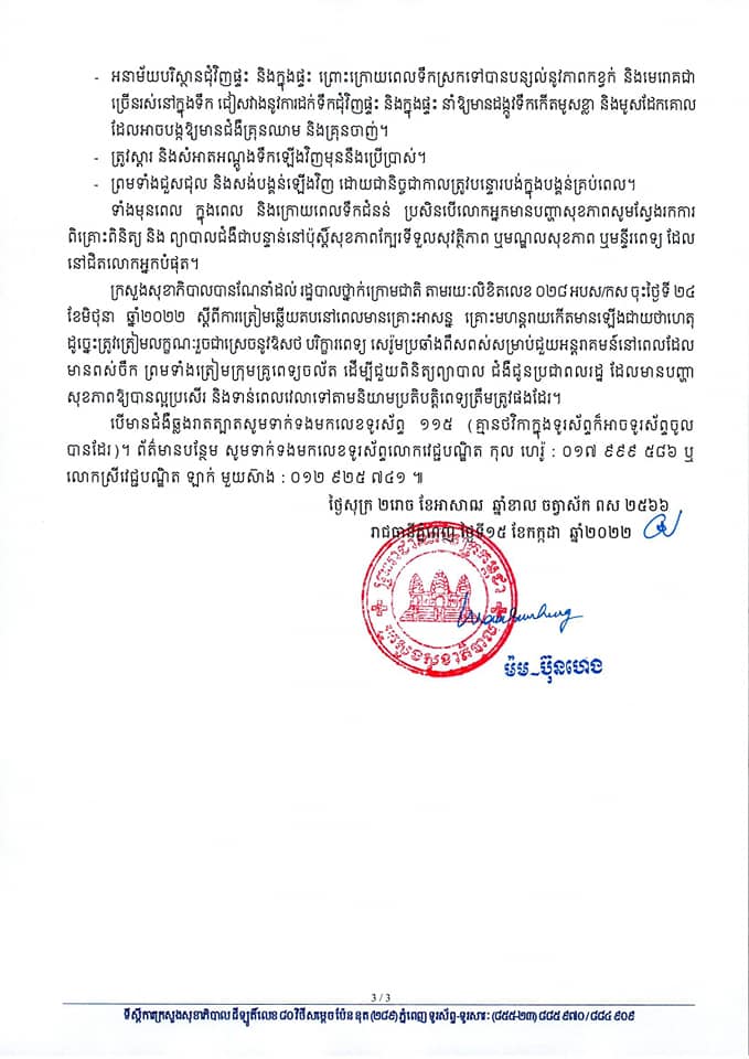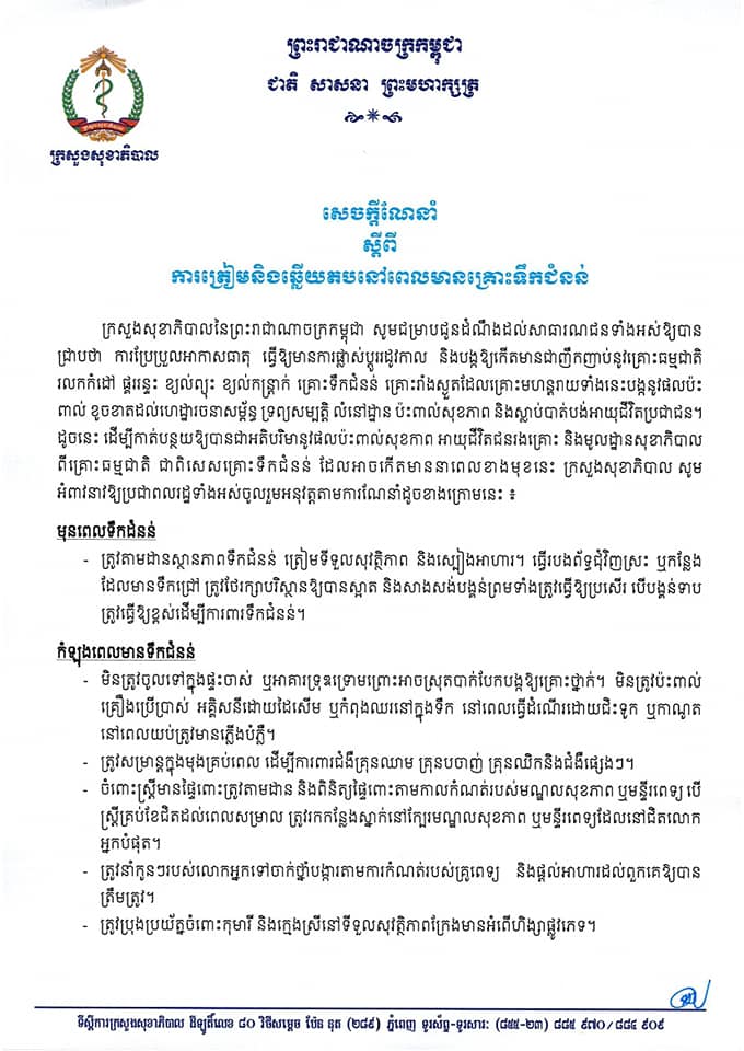 ក្រសួងសុខាភិបាលនៃព្រះរាជាណាចក្រកម្ពុជា សូមជម្រាបជូនដំណឹងដល់សាធារណជនទាំងអស់ឱ្យបានជ្រាបថា ការប្រែប្រួលអាកាសធាតុ ធ្វើឱ្យមានការផ្លាស់ប្ដូររដូវកាល និងបង្កឱ្យកើតមានជាញឹកញាប់នូវគ្រោះធម្មជាតិ រលកកំដៅ ផ្គររន្ទះ ខ្យល់ព្យុះ ខ្យល់កន្ត្រាក់ គ្រោះទឹកជំនន់ គ្រោះរាំងស្ងួតដែលរងគ្រោះមហន្តរាយទាំងនេះ បង្កនូវផលប៉ះពាល់ ខូចខាតដល់ហេដ្ឋារចនាសម្ព័ន្ធ ទ្រព្យសម្បត្តិ លំនៅដ្ឋាន ប៉ះពាល់សុខភាព និងស្លាប់បាត់បង់អាយុជីវិតប្រជាជន។ ដូចនេះ ដើម្បីកាត់បន្ថយឱ្យបានជាអតិបរិមានូវផលប៉ះពាល់សុខភាព អាយុជីវិតជនរងគ្រោះ និងមូលដ្ឋានសុខាភិបាលពីគ្រោះធម្មជាតិ ជាពិសេសគ្រោះទឹកជំនន់ ដែលអាចកើតមាននាពេលខាងមុខនេះ ក្រសួងសុខាភិបាល សូមអំពាវនាវ ឱ្យប្រជាពលរដ្ឋទាំងអស់ ចូលរួមអនុវត្តតាមការណែនាំដូចខាងក្រោម៖