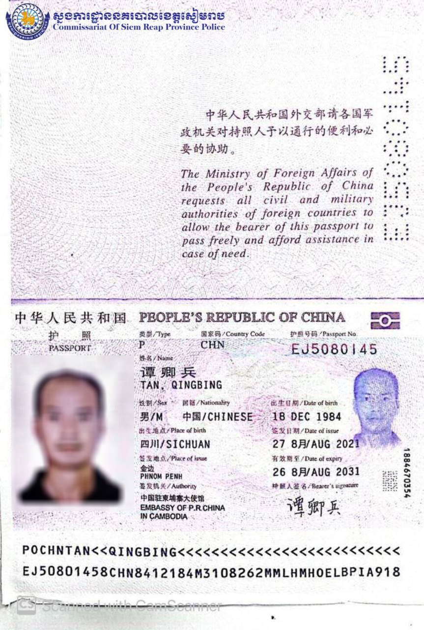 ជនសង្ស័យឈ្មោះ TAN QINGBING ភេទប្រុស កើតថ្ងៃទី១៨-១២-១៩៨៤ ជនជាតិចិន កាន់លិខិតឆ្លងដែនលេខEJ៥០៨០១៤៥ មុខរបរអ្នកគ្រប់គ្រងទូទៅក្រុមហ៊ុន XING ZHENG GIAN Co.Ltd ស្នាក់នៅក្នុងការដ្ឋានព្រលានយន្តហោះអន្តរជាតិសៀមរាបថ្មី ភូមិប្រវ៉ាល ឃុំពពេល ស្រុកសូទ្រនិគម ខេត្តសៀមរាប។