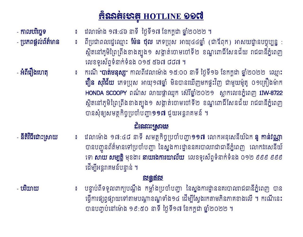រាជធានីភ្នំពេញ៖ យោងតាមការចុះផ្សាយរបស់ Hotline 117 នៅថ្ងៃទី១៨ ខែកក្កដា ឆ្នាំ២០២២ បានឲ្យដឹងថា ករណី “បាត់មនុស្ស” កាលពីវេលាម៉ោង ១៥៖០០ នាទី ថ្ងៃទី១៦ ខែកក្កដា ឆ្នាំ២០២២ ឈ្មោះ វឿន សុវិជ័យ ភេទប្រុស អាយុ ១៧ឆ្នាំ មិនឃើញមកផ្ទះវិញ ជាមួយម៉ូតូ ១គ្រឿងម៉ាក HONDA SCOOPY ពណ៌ស លាយផ្កាឈូក សេរីឆ្នាំ២០២២ ស្លាកលេខភ្នំពេញ 1IW-8722 ស្ថិតនៅភូមិព្រៃព្រីងខាងត្បូង១ សង្កាត់ចោមចៅទី២ ខណ្ឌពោធិ៍សែនជ័យ រាជធានីភ្នំពេញ ត្រូវបាននគរបាលចុះអន្ដរាគមន៍ស្រាវជ្រាវ និងផ្សព្វផ្សាយ ក្រោយឪពុកក្មេងរាយការណ៍មកកាន់លេខ ១១៧ ។