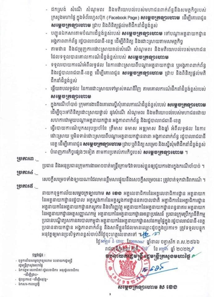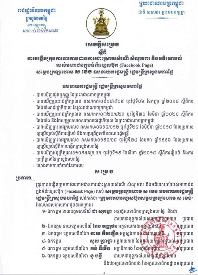 រាជធានីភ្នំពេញ៖ យោងតាមសារលិខិតរបស់ រាជរដ្ឋាភិបាលកម្ពុជា នៅថ្ងៃទី២០ ខែកក្កដា ឆ្នាំ២០២២ បានឲ្យដឹងថា សម្តេចក្រឡាហោម ស ខេង ឧបនាយករដ្ឋមន្ត្រី រដ្ឋមន្ត្រីក្រសួងមហាផ្ទៃ បានចេញសេចក្តីសម្រេច ស្តីពីការបង្កើតក្រុមការងារតាមដានការដោះស្រាយសំណើ សំណូមពរ និងមតិយោបល់របស់មហាជនក្នុងទំព័រហ្វេសប៊ុក (Facebook Page) ។