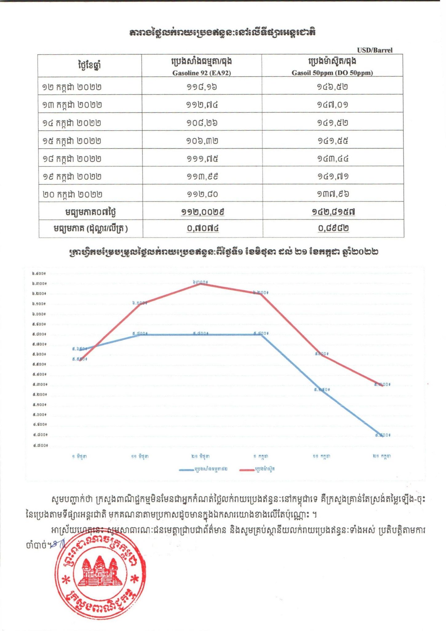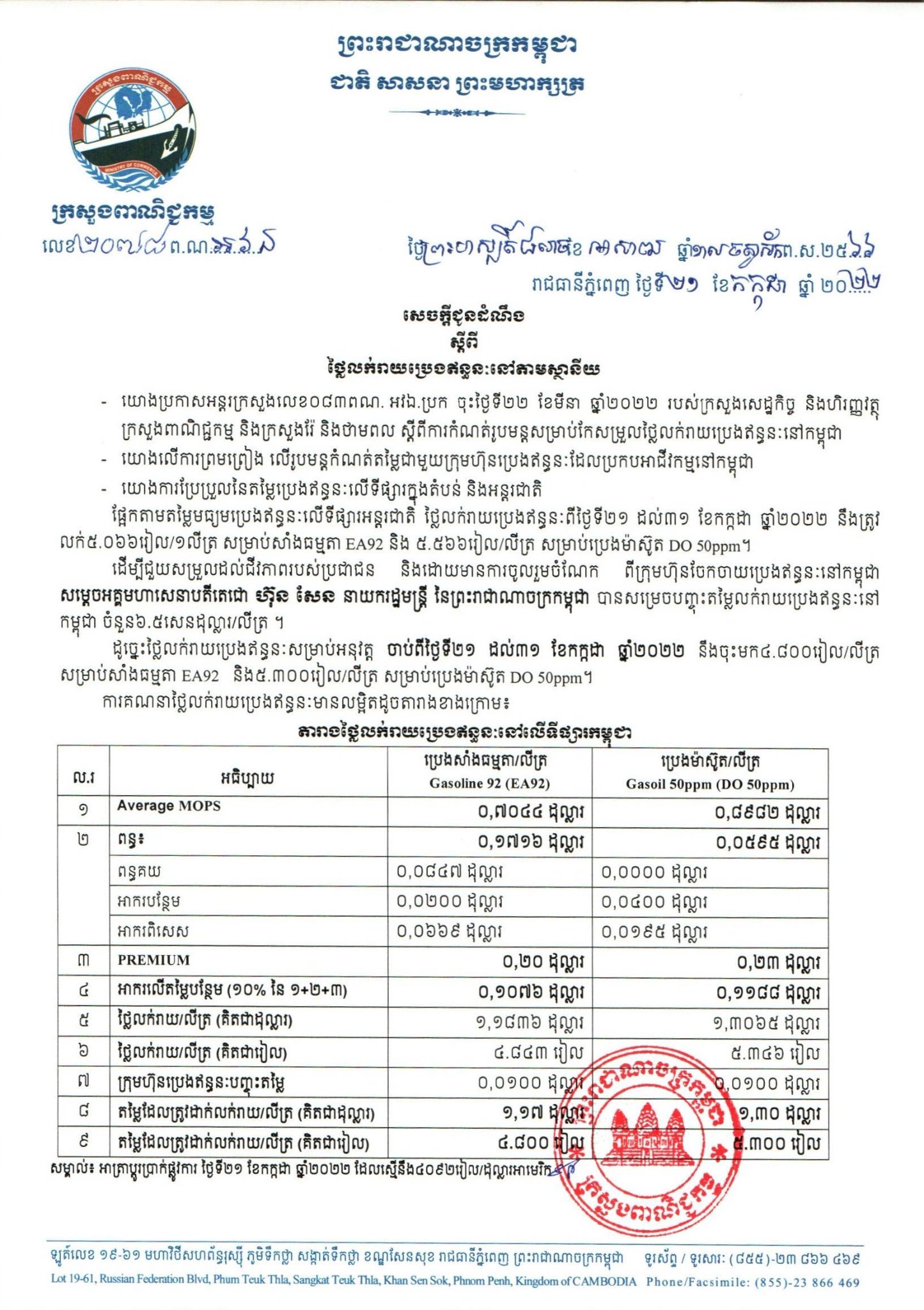 រាជធានីភ្នំពេញ៖ យោងតាមលិខិតរបស់ក្រសួងពាណិជ្ជកម្ម ចុះផ្សាយថ្ងៃទី២១ ខែកក្កដា ឆ្នាំ២០២២ ស្តីអំពីតម្លៃលក់រាយប្រេងឥន្ធនៈនៅតាមស្ថានីយទាំងអស់ក្នុងព្រះរាជាណាចក្រកម្ពុជាសម្រាប់អនុវត្តទៅតាមតម្លៃមធ្យមប្រេងឥន្ធនៈលើទីផ្សារអន្តរជាតិ ចាប់ពីថ្ងៃទី២១ ដល់ថ្ងៃទី៣១ ខែកក្កដា ឆ្នាំ២០២២ បានឲ្យដឹងថា តម្លៃប្រេងសាំងធម្មតាមានតម្លៃ ៤,៨០០រៀលក្នុងមួយលីត្រ ចំណែកឯប្រេងសាំងម៉ាស៊ូតមានតម្លៃ ៥,៣០០រៀលក្នុងមួយលីត្រប៉ុណ្ណោះ។