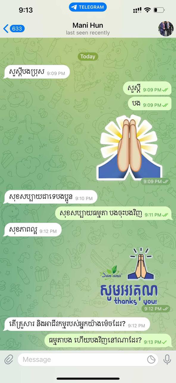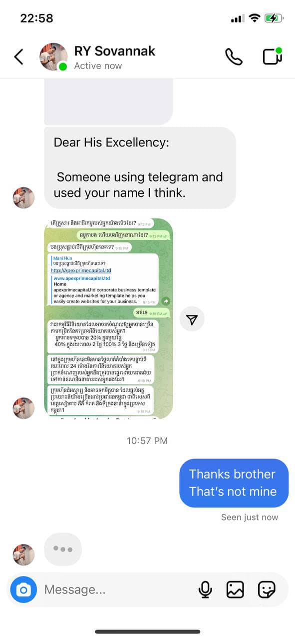 រាជធានីភ្នំពេញ៖ យោងតាមគណនីហ្វេសប៊ុកផ្ទាល់របស់ ឯកឧត្តម ហ៊ុន ម៉ានី ប្រធានសហភាពសហព័ន្ធយុវជនកម្ពុជា នៅថ្ងៃទី២២ ខែកក្កដា ឆ្នាំ២០២២ សូមប្រកាសច្រានចោល ចំពោះគណនីតេលេក្រាមក្លែងក្លាយ ដោយប្រើប្រាស់ឈ្មោះ និងរូបភាពរបស់លោក ដើម្បីផ្សព្វផ្សាយអាជីវកម្ម និងបញ្ហាផ្សេងៗ។