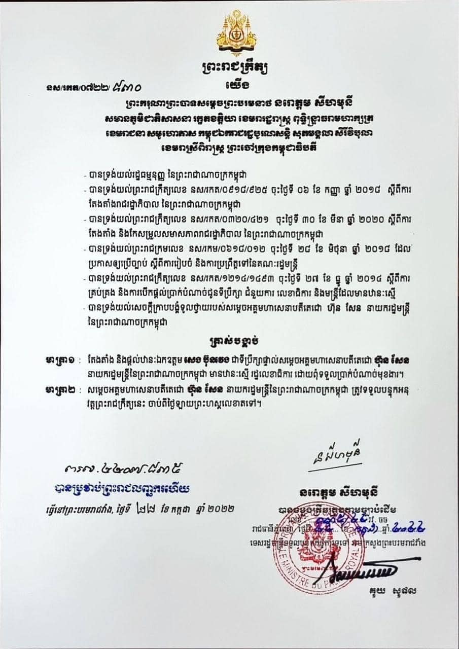 ព្រះមហាក្សត្រចេញព្រះរាជក្រឹត្យតែងតាំង អាចារ្យអេ ជាទីប្រឹក្សាផ្ទាល់របស់សម្ដេចតេជោ