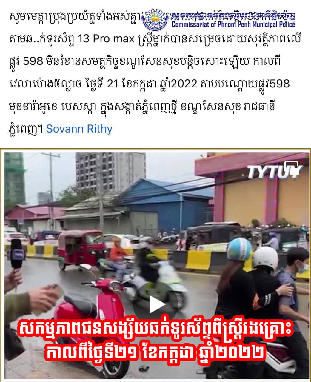 យោងតាមការចុះផ្សាយរបស់ ស្នងការដ្ឋាននគរបាលរាជធានីភ្នំពេញ បានឲ្យដឹងថា ជនសង្ស័យចំនួន ២នាក់ ក្នុងចំណោមបក្សពួក ៣នាក់ ដែលបានឆក់ទូរស័ព្ទពីស្ត្រីម្នាក់កាលពីល្ងាចថ្ងៃទី២១ ខែកក្កដា ឆ្នាំ២០២២ នៅតាមបណ្តោយផ្លូវ ៥៩៨ សង្កាត់ភ្នំពេញថ្មី ខណ្ឌសែនសុខ ត្រូវបានសមត្ថកិច្ចនៃអធិការដ្ឋាននគរបាលខណ្ឌសែនសុខ ដឹកនាំដោយលោកវរសេនីយ៍ឯក ហួរ ម៉េងវាង អធិការនគរបាលខណ្ឌ ស្រាវជ្រាវ និងឃាត់ខ្លួនបាននៅព្រឹកថ្ងៃទី២៥ ខែកក្កដា ឆ្នាំ២០២២ នៅចំនុច ផ្ទះសំណាក់ ស្តិតក្នុងភូមិដំណាក់ សង្កាត់គោកឃ្លាង ខណ្ឌសែនសុខ រាជធានីភ្នំពេញ។