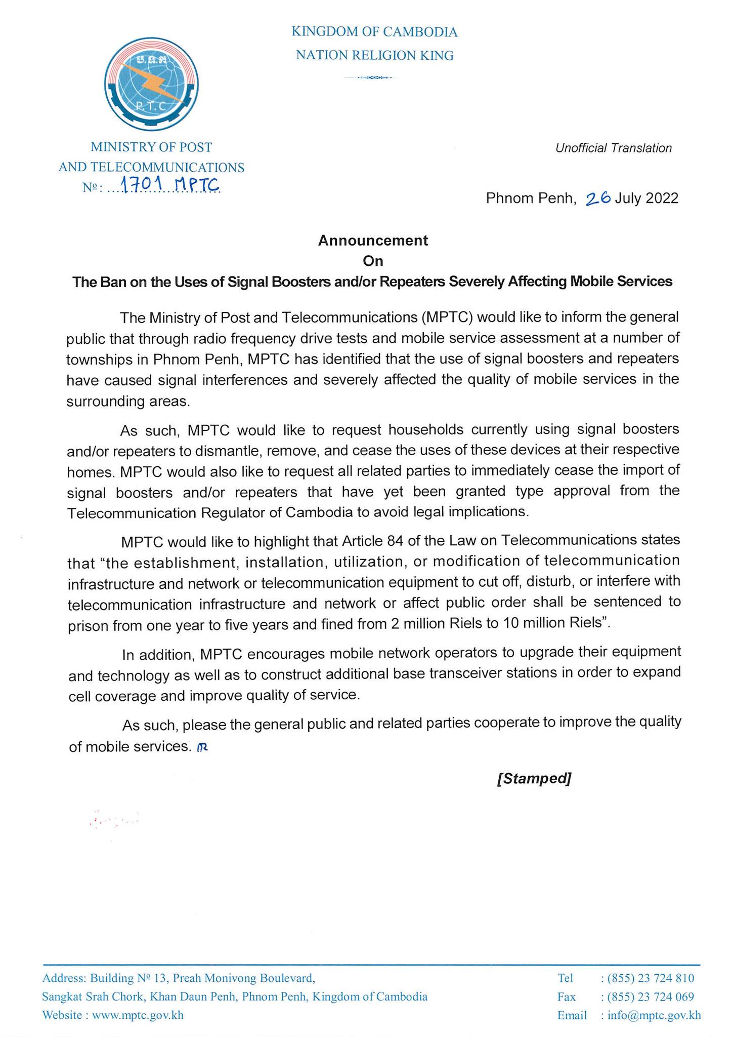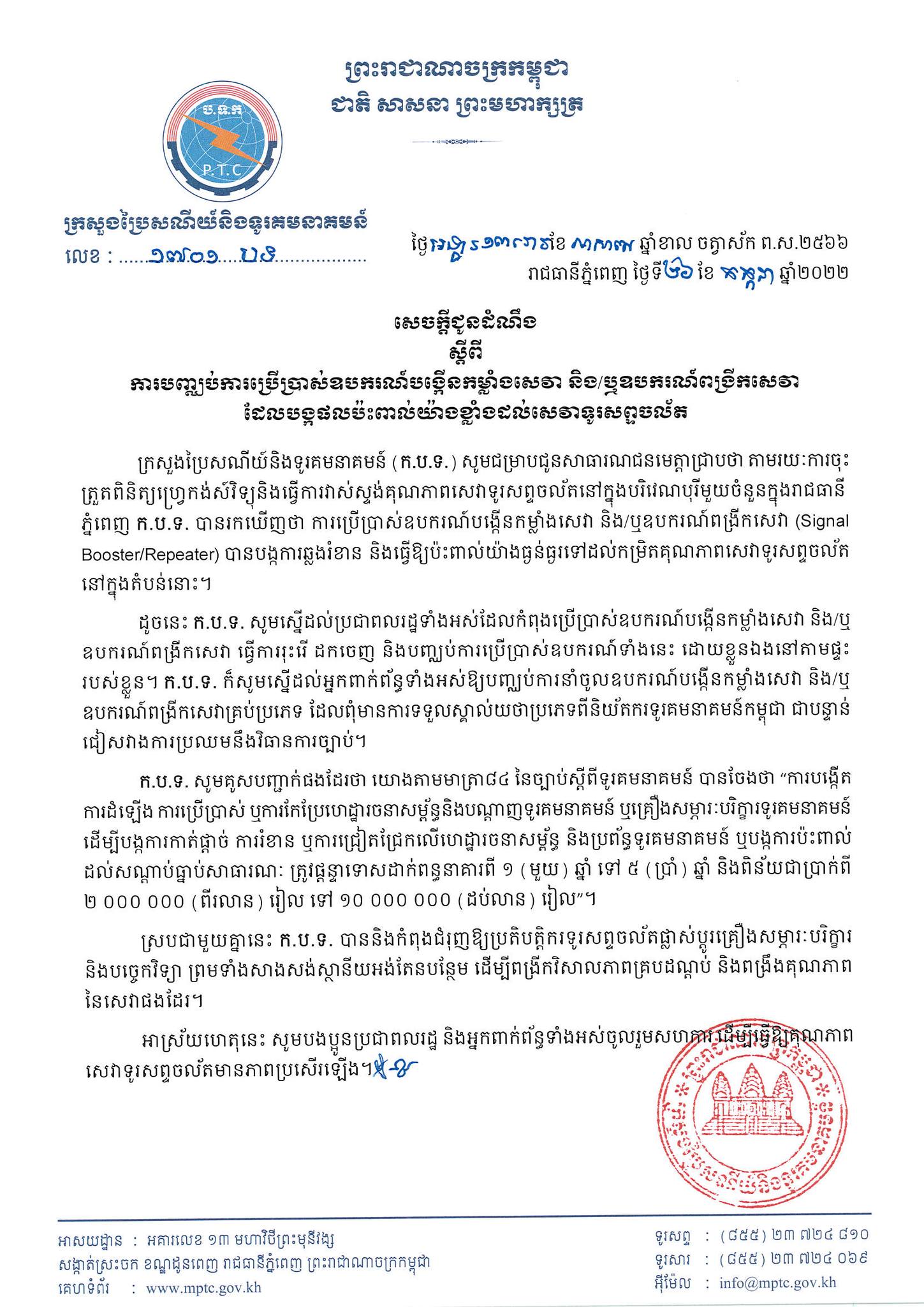 ក្រសួងប្រៃសណីយ៍ ជូនដំណឹងពីការបញ្ឈប់ឱ្យប្រើប្រាស់ឧបករណ៍បង្កើនកម្លាំងសេវា ឬឧបករណ៍ពង្រីកសេវាដែលបង្កផលប៉ះពាល់យ៉ាងខ្លាំងដល់សេវាទូរសព្ទចល័ត