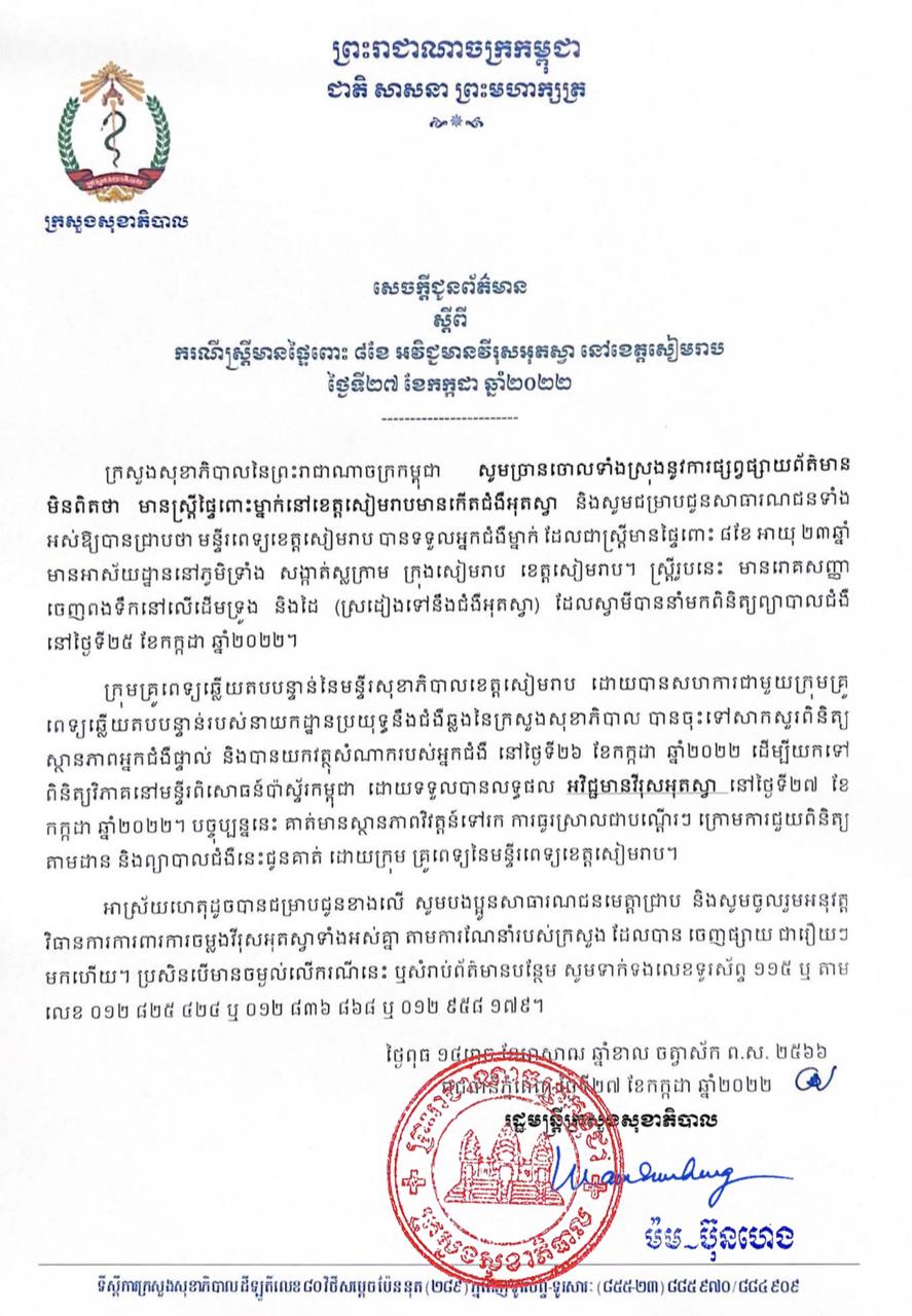 ក្រសួងសុខាភិបាល សូមច្រានចោលទាំងស្រុងនូវការផ្សព្វផ្សាយព័ត៌មាន មិនពិតថា មានស្រ្តីផ្ទៃពោះម្នាក់នៅខេត្តសៀមរាបមានកើតជំងឺអុតស្វា និងសូមជម្រាបជូនសាធារណជនទាំងអស់ឱ្យបានជ្រាបថា មន្ទីរពេទ្យសៀមរាប បានទទួលអ្នកជំងឺម្នាក់ ដែលជាស្ត្រីមានផ្ទៃពោះ ៨ខែ អាយុ ២៣ឆ្នាំ មានអាស័យដ្ឋាននៅភូមិទ្រាំង សង្កាត់ស្លក្រាម ក្រុងសៀមរាប ខេត្តសៀមរាប។ ស្រ្តីរូបនេះ មានរោគសញ្ញាចេញពងទឹកនៅលើដើមទ្រូង និងដៃ (ស្រដៀងទៅនឹងជំងឺអុតស្វា) ដែលស្វាមីបាននាំមកពិនិត្យព្យាបាលជំងឺនៅថ្ងៃទី២៥ ខែកក្កដា ឆ្នាំ២០២២។