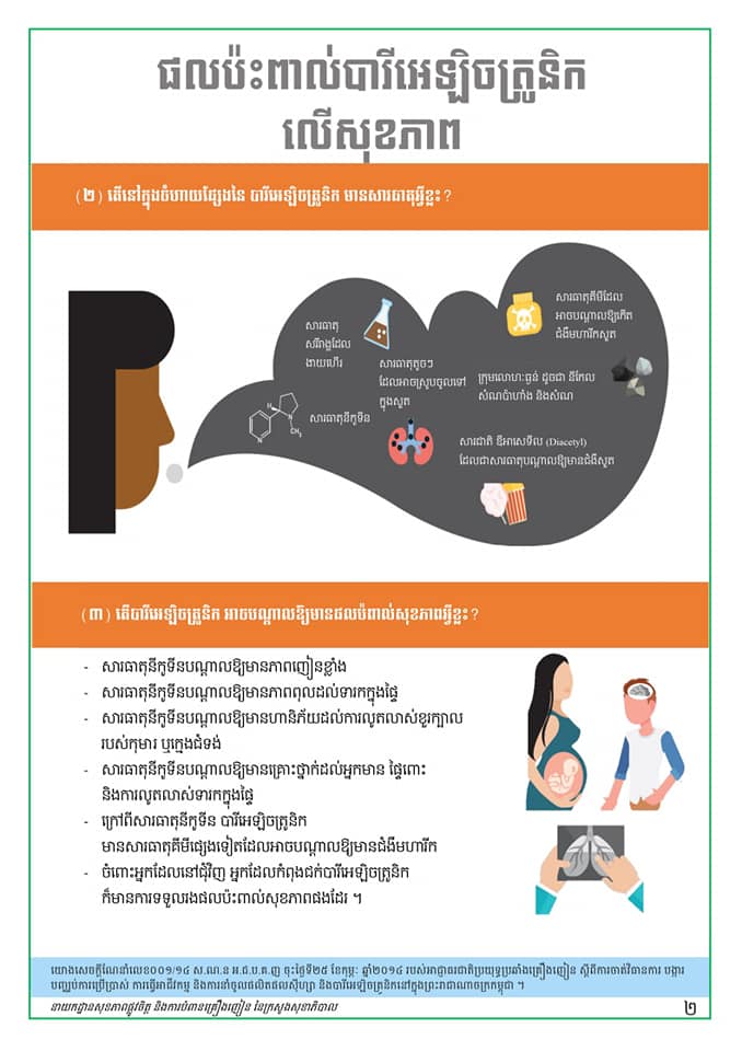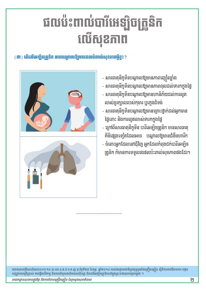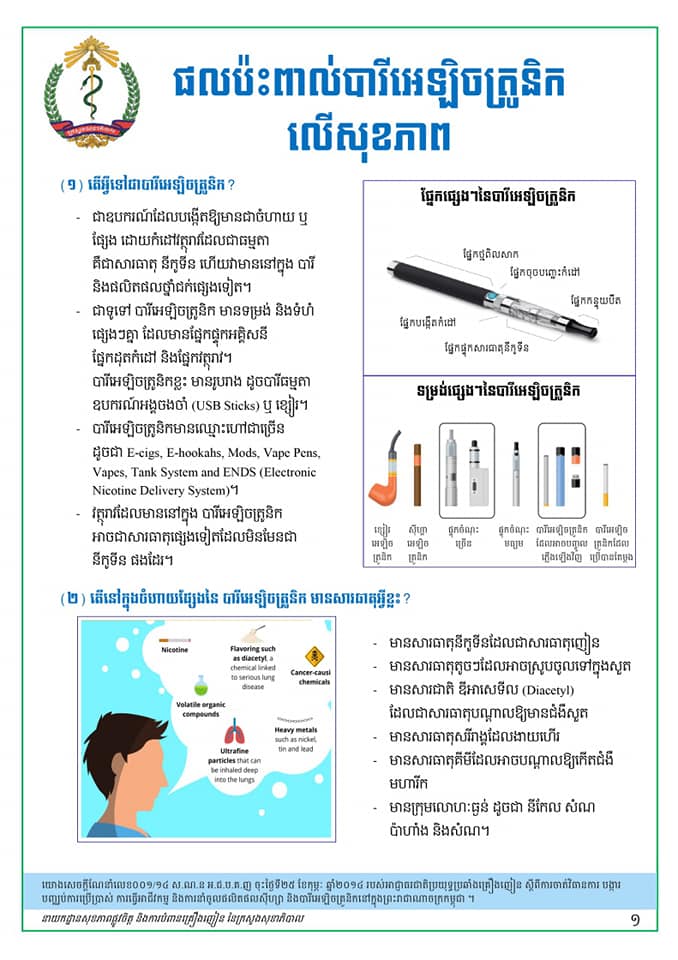 រាជធានីភ្នំពេញ៖ យោងតាមការចុះផ្សាយរបស់ ក្រសួងសុខាភិបាល នៅថ្ងៃទី២៩ ខែកក្កដា ឆ្នាំ២០២២ បានចេញសារអប់រំសុខភាព ស្តីពីផលប៉ះពាល់បារីអេឡិចត្រូនិកលើសុខភាព។
