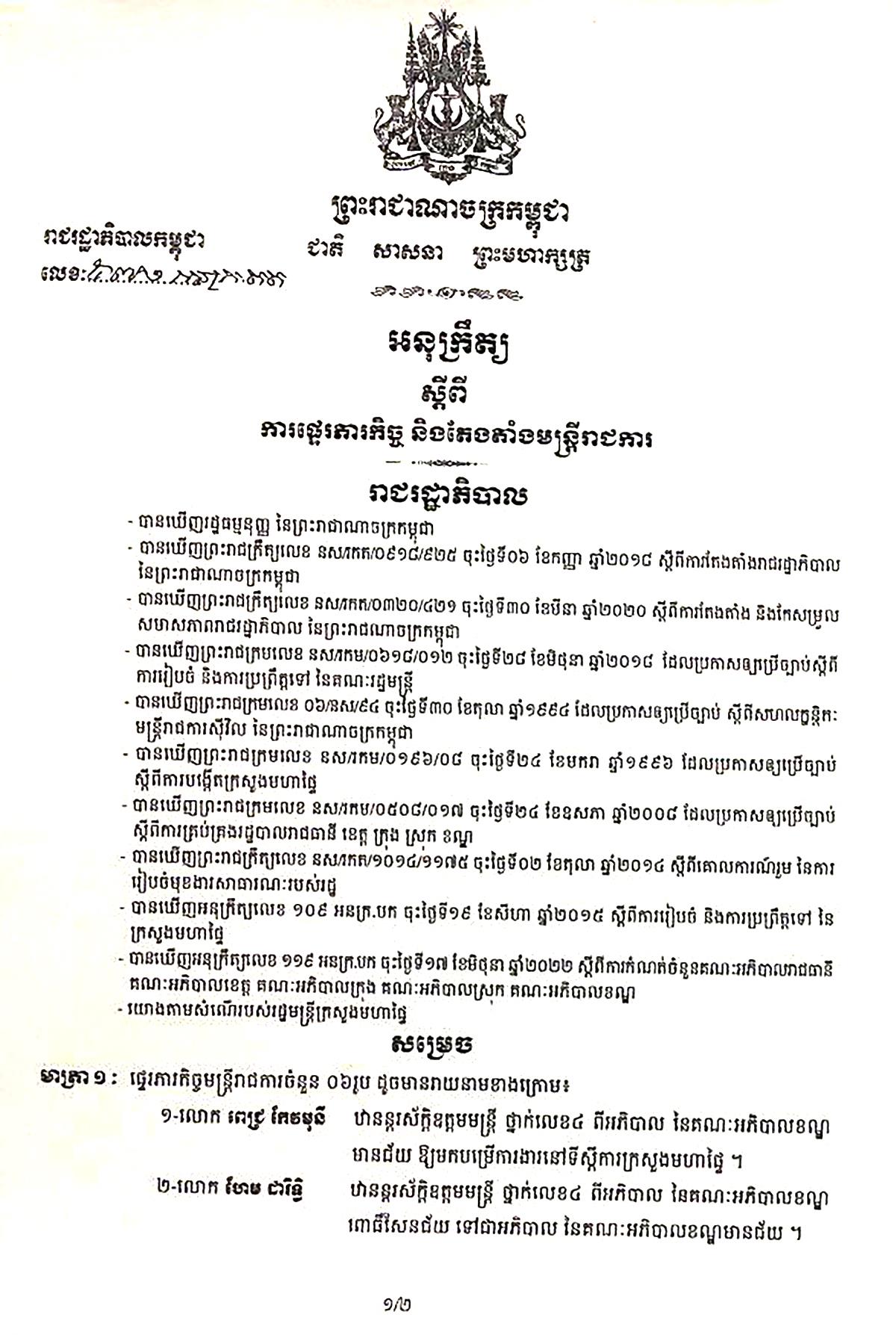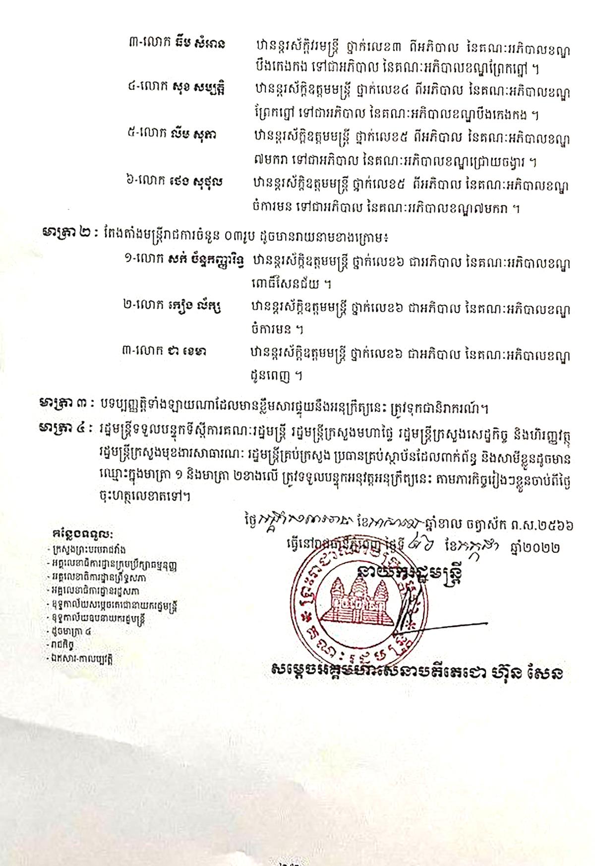 ២-លោក ហែម ដារិទ្ធិ ឋានន្តរស័ក្តិឧត្តមមន្ត្រី ថ្នាក់លេខ៤ អភិបាលនៃគណៈអភិបាលខណ្ឌពោធិ៍សែនជ័យ ទៅជាអភិបាល នៃគណៈអភិបាលខណ្ឌមានជ័យ ។