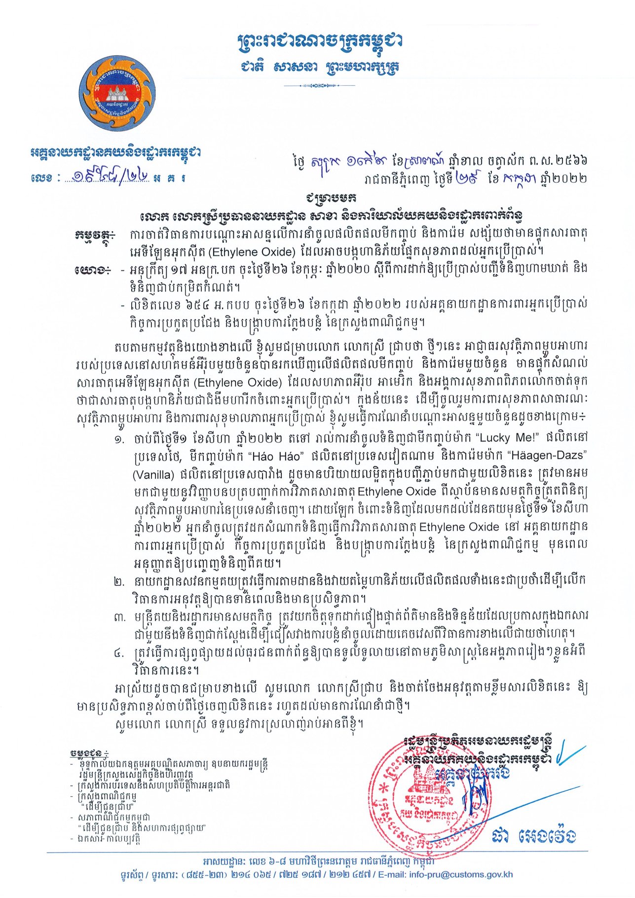 យោងតាមការបញ្ជាក់ពី អគ្គនាយកដ្ឋានគយនិងរដ្ឋាករកម្ពុជា បានចេញលិខិត ស្តីពីការចាត់វិធានការបណ្តោះអាសន្នលើការនាំចូលផលិតផលមីកញ្ចប់ និងការ៉េម សង្ស័យថាមានផ្ទុកសារធាតុ អេទីឡែនអុកស៊ីត (Ethylene Oxide) ដែលអាចបង្កហានិភ័យផ្នែកសុខភាពដល់អ្នកប្រើប្រាស់។