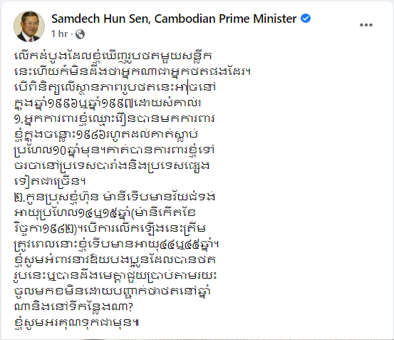 សម្តេចតេជោ ហ៊ុន សែន អំពាវនាវរកអ្នកថតរូបមួយសន្លឹកនេះ ជួយប្រាប់តាមរយៈ ចូលមកខមិនដោយបញ្ជាក់ថាថតនៅឆ្នាំណា និងនៅទីកន្លែងណា?