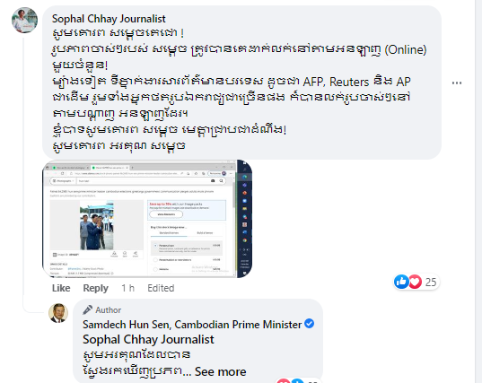 ជាការឆ្លើយតបនឹងខំមិនសម្ដេចតេជោ ហ៊ុន សែន បានថ្លែងអំណរអរគុណ ដែលលោកបានស្វែងរកឃើញប្រភពរូបថតនេះ ដោយសម្ដេចបានបញ្ជាក់ទៀតថា៖ «ពេលនេះរូបថតខ្ញុំដល់កំរិតជនបរទេសយកទៅដាក់លក់តាម online នៅក្រៅប្រទេសហើយ។ តាមស្មាននៅមាន រូបថតច្រើនទៀត ដែលជនបរទេសថតហើយអាចនឹងដាក់លក់សូមជួយស្វែងរកទិញនូវរូបថតណាដែលយើងមិនមាន»