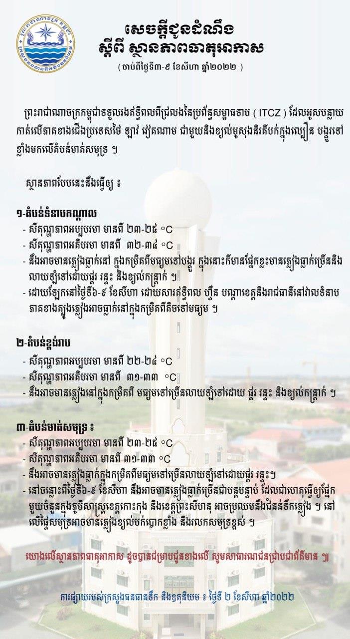 រាជធានីភ្នំពេញ៖ យោងតាមការចុះផ្សាយរបស់ ក្រសួងធនធានទឹក និងឧតុនិយម នៅថ្ងៃទី០២ ខែសីហា ឆ្នាំ២០២២ បានចេញសេចក្ដីជូនដំណឹងស្ដីពីស្ថានភាពធាតុអាកាសចាប់ពីថ្ងៃទី០៣ ដល់ថ្ងៃទី០៩ ខែសីហា ឆ្នាំ២០២២ បានឱ្យដឹងថា៖