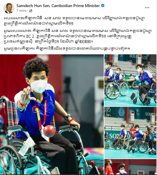 សម្តេចតេជោ ហ៊ុន សែន អបអរសាទរកីឡាការិនី សន សាល ទទួលបានមេដាយមាស លើវិញ្ញាសាឯកត្តជនប៊ូស្យា ក្នុងព្រឹត្តិការណ៍អាស៊ានប៉ារ៉ាហ្គេមលើកទី១១