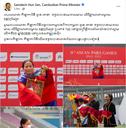 នៅក្នុងគណនីហ្វេសប៊ុករបស់ សម្តេចតេជោ បានសរសេរថា៖ សូមអបអរសាទរ កីឡាការិនីអត្តពលកម្មជនពិការកម្ពុជា ងួន រតនា ទទួលបានមេដាយមាស លើវិញ្ញាសារត់ចម្ងាយ ១៥០០ម៉ែត្រ ប្រភេទ T46 នៅក្នុងព្រឹត្តិការណ៍អាស៊ានប៉ារ៉ាហ្គេមលើកទី១១ ឆ្នាំ២០២២ នៅប្រទេសឥណ្ឌូនេស៊ី។ ជូនពរកីឡាករ កីឡាការិនីយើងទទួលបានជោគជ័យជាបន្តបន្ទាប់ទៀត៕
