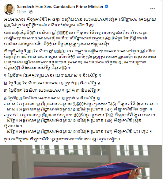 សម្តេចតេជោ ហ៊ុន សែន អបអរសាទរកីឡាការិនី វ៉ិត ចន្ថា ដណ្តើមបាន មេដាយមាស១ទៀត លើវិញ្ញាសារ រត់ចម្ងាយ ៤០០ម៉ែត្រ នៃព្រឹត្តិការណ៍អាស៊ានប៉ារ៉ាហ្គេមលើកទី១១