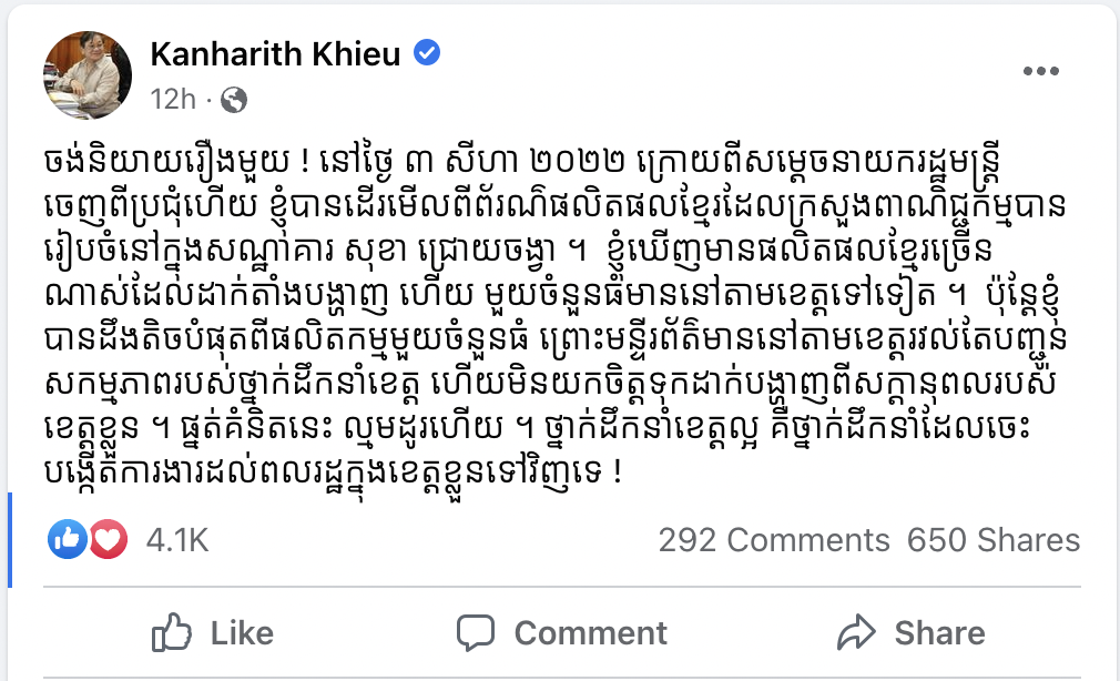 «ចង់និយាយរឿងមួយ ! នៅថ្ងៃ ៣ សីហា ២០២២ ក្រោយពីសម្តេចនាយករដ្ឋមន្ត្រីចេញពីប្រជុំហើយ ខ្ញុំបានដើរមើលពិព័រណ៌ផលិតផលខ្មែរដែលក្រសួងពាណិជ្ជកម្មបានរៀបចំនៅក្នុងសណ្ឋាគារ សុខា ជ្រោយចង្វារ។ ខ្ញុំឃើញមានផលិតផលខ្មែរច្រើនណាស់ដែលដាក់តាំងបង្ហាញ ហើយមួយចំនួនធំមាននៅតាមខេត្តទៅទៀត ។ ប៉ុន្តែខ្ញុំបានដឹងតិចបំផុតពីផលិតកម្មមួយចំនួនធំ ព្រោះមន្ទីរព័ត៌មាននៅតាមខេត្តរវល់តែបញ្ជូនសកម្មភាពរបស់ថ្នាក់ដឹកនាំខេត្ត ហើយមិនយកចិត្តទុកដាក់បង្ហាញពីសក្តានុពលរបស់ខេត្តខ្លួន ។ ផ្នត់គំនិតនេះ ល្មមដូរហើយ ។ ថ្នាក់ដឹកនាំខេត្តល្អ គឺថ្នាក់ដឹកនាំដែលចេះបង្កើតការងារដល់ពលរដ្ឋក្នុងខេត្តខ្លួនទៅវិញទេ!»