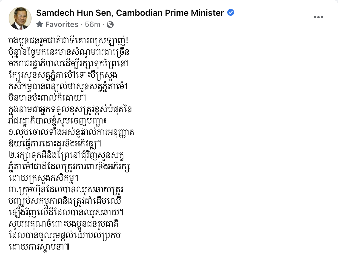 “បងប្អូនជនរួមជាតិជាទីគោរពស្រឡាញ់! ប៉ុន្មានថ្ងៃមកនេះមានសំណូមពរជាច្រើនមករាជរដ្ឋាភិបាលដើម្បីរក្សាទុកព្រៃនៅក្បែរសួនសត្វភ្នំតាម៉ៅទោះបីក្រសួងកសិកម្មបានពន្យល់ថាសួនសត្វភ្នំតាម៉ៅមិនមានប៉ះពាល់ក៏ដោយ។ ក្នុងនាមជាអ្នកទទួលខុសត្រូវខ្ពស់បំផុតនៃ រាជរដ្ឋាភិបាលខ្ញុំសូមចេញបញ្ជា៖