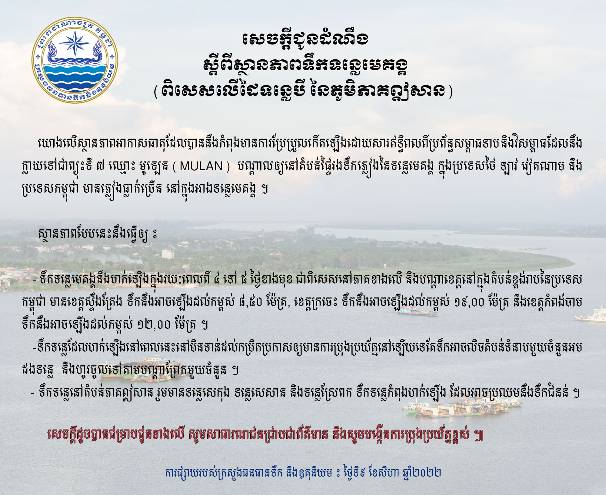 រាជធានីភ្នំពេញ៖ យោងតាមការចុះផ្សាយរបស់ ក្រសួងធនធានទឹក និងឧតុនិយម នៅថ្ងៃទី០៩ ខែសីហា ឆ្នាំ២០២២ បានចេញសេចក្ដីជូនដំណឹង ស្ដីពីស្ថានភាពទឹកទន្លេមេគង្គ (ពិសេសលើដៃទន្លេបី នៃភូមិភាគឦសាន។