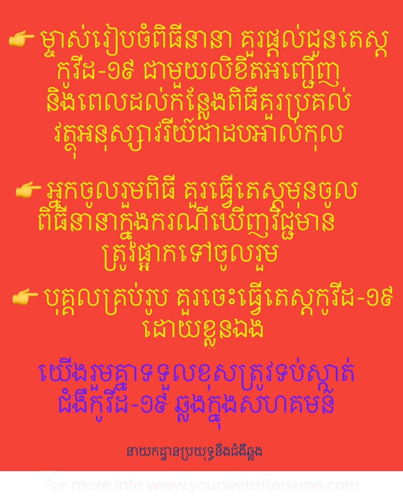 ទី២.អ្នកចូលរួមពិធី គួរធ្វើតេស្តមុនចូលពិធីនានា ក្នុងករណីឃើញវិជ្ជមានត្រូវផ្អាកទៅចូលរួម។