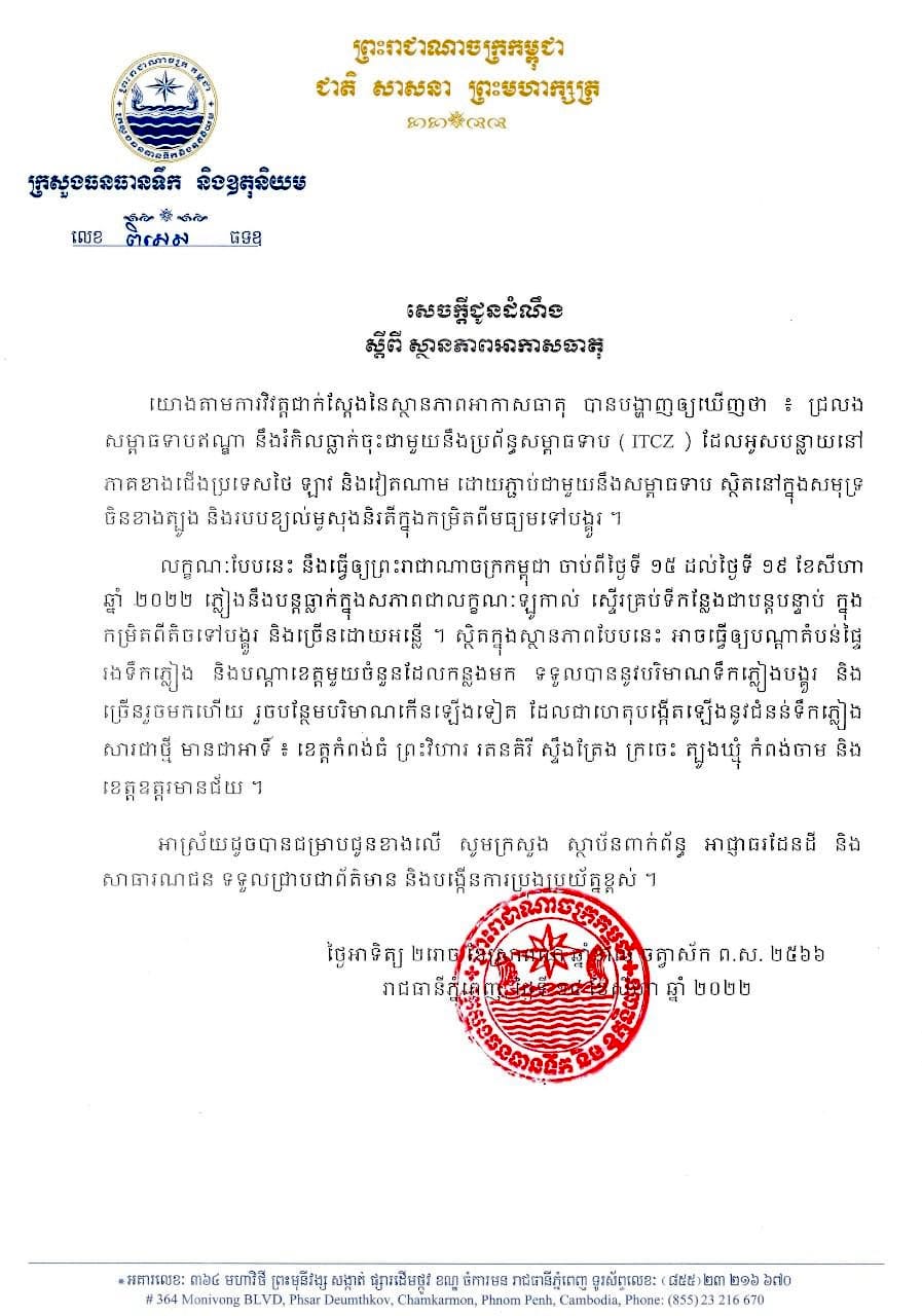 លក្ខណៈបែបនេះ នឹងធ្វើឲ្យព្រះរាជាណាចក្រកម្ពុជា ចាប់ពីថ្ងៃទី១៥ ដល់ថ្ងៃទី ១៩ ខែសីហា ឆ្នាំ២០២២ ភ្លៀងនឹងបន្តធ្លាក់ក្នុងសភាពជាលក្ខណៈឡូកាល់ ស្ទើរគ្រប់ទីកន្លែងជាបន្តបន្ទាប់ ក្នុងកម្រិតពីតិចទៅបង្គួរ និងច្រើនដោយអន្លើរ។ ស្ថិតក្នុងស្ថានភាពបែបនេះ អាចធ្វើឲ្យបណ្តាតំបន់ផ្ទៃរងទឹកភ្លៀង និងបណ្តាខេត្តមួយចំនួនដែលកន្លងមក ទទួលបាននូវបរិមាណទឹកភ្លៀងបង្គួរ និងច្រើនរួចមកហើយ រួចបន្ថែមបរិមាណកើនឡើងទៀត ដែលជាហេតុបង្កើតឡើងនូវជំនន់ទឹកភ្លៀងសារជាថ្មី មានជាអាទិ៍៖ ខេត្តកំពង់ធំ ព្រះវិហារ រតនគិរី ស្ទឹងត្រែង ក្រចេះ ត្បូងឃ្មុំ កំពង់ចាម និងខេត្តឧត្តរមានជ័យ។