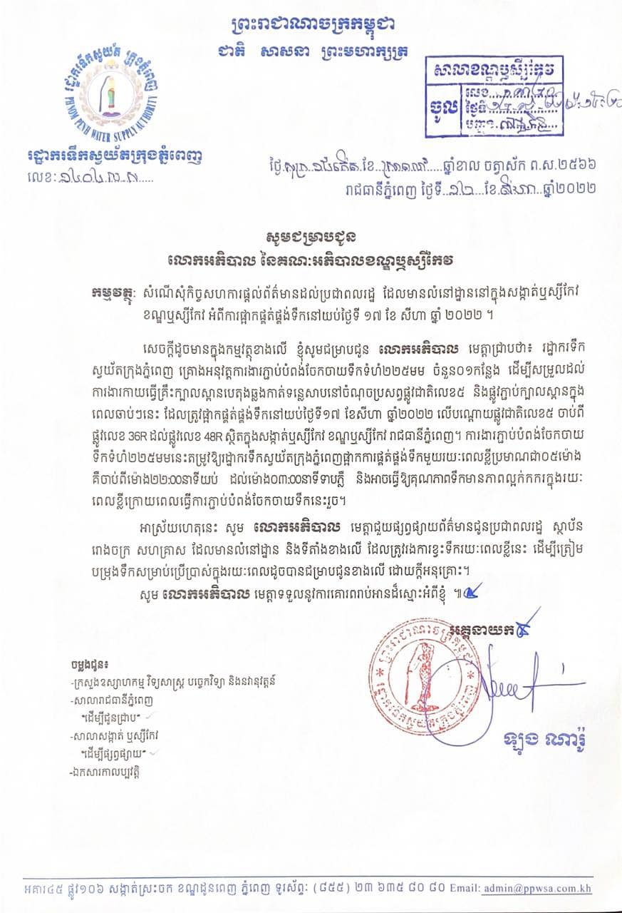 អាស្រ័យហេតុនេះ សូម អភិបាល មេត្តាជួយផ្សព្វផ្សាយព័ត៌មានជូនប្រជាពលរដ្ឋ ស្ថាប័ន រោងចក្រ សហគ្រាស ដែលមានលំនៅដ្ឋាន និងទីតាំងខាងលើ ដែលត្រូវរងការខ្វះទឹករយៈពេលខ្លីនេះ ដើម្បីត្រៀមបម្រុងទឹក សម្រាប់ប្រើប្រាស់ ក្នុងរយៈពេលដូចបានជម្រាបជូនខាងលើ ដោយក្ដីអនុគ្រោះ ៕