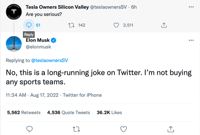 មូលហេតុដែលគាត់បានបញ្ជាក់ពីការលើកឡើងនេះវិញ គឺដោយសារអ្នកលេងបណ្ដាញម្នាក់បានសួរគាត់ថា៖«តើគាត់និយាយពិតមែនឬ?» ហើយលោក Elon Musk ក៏បានឆ្លើយទៅវិញថា៖«ទេ។ នេះគ្រាន់ជារឿងកំប្លែងដ៏យូរលង់នៅលើ Twitter។ ខ្ញុំមិនទិញយកក្រុមកីឡាណាមួយឡើយ។» ដោយបានបន្ថែមថា៖«ទោះជាបែបនេះក៏ដោយ បើសួរថាខ្ញុំចូលចិត្តក្រុមណា ខ្ញុំនឹងរើសយក Man U។ ពួកគេគឺជាក្រុមដែលខ្ញុំចូលចិត្តកាលពីកុមារភាព។»
