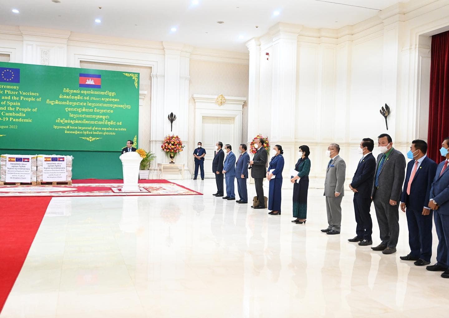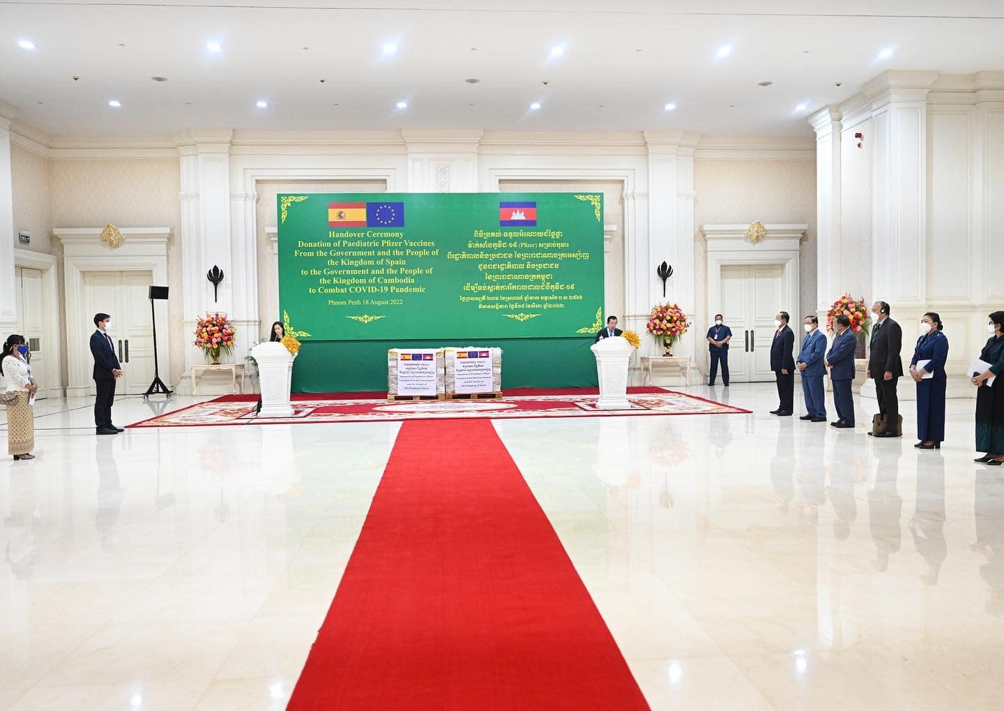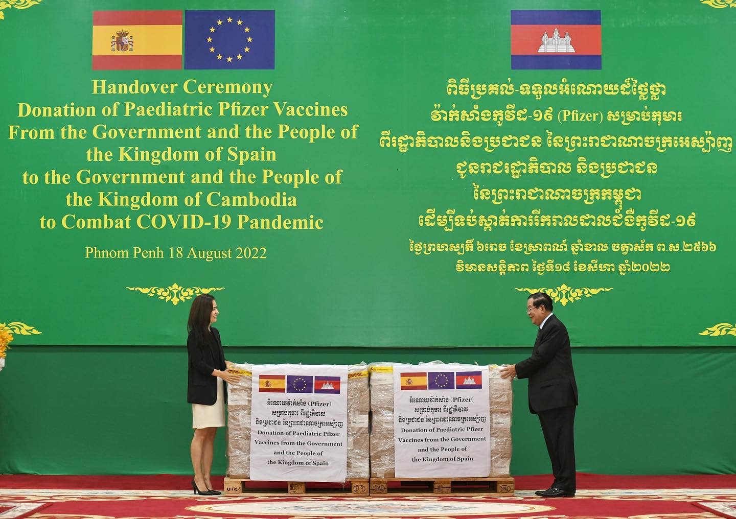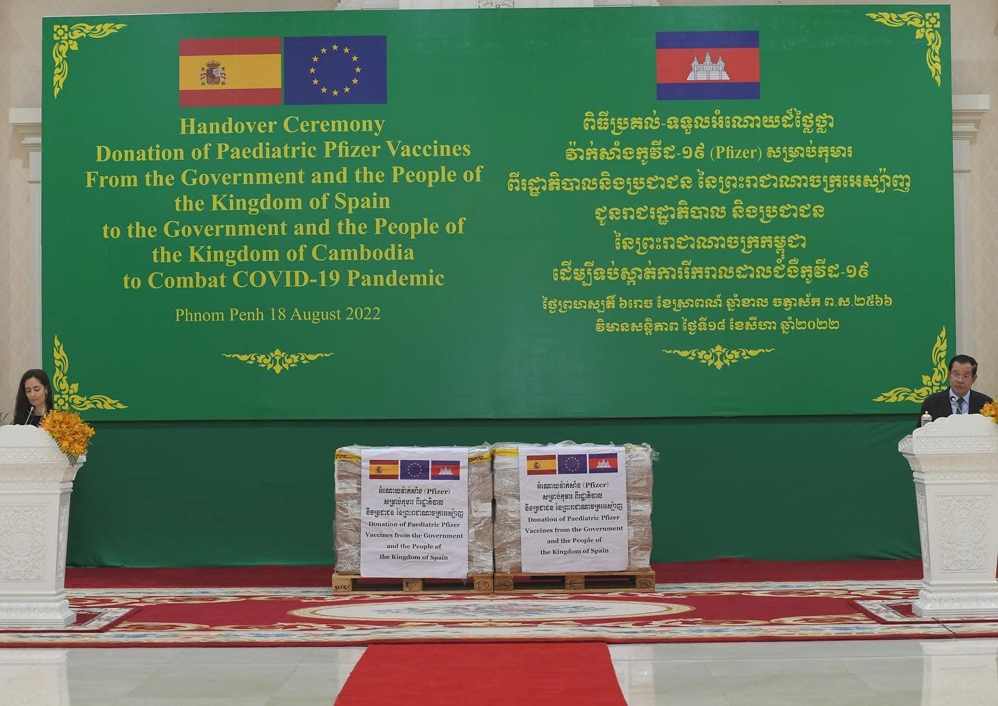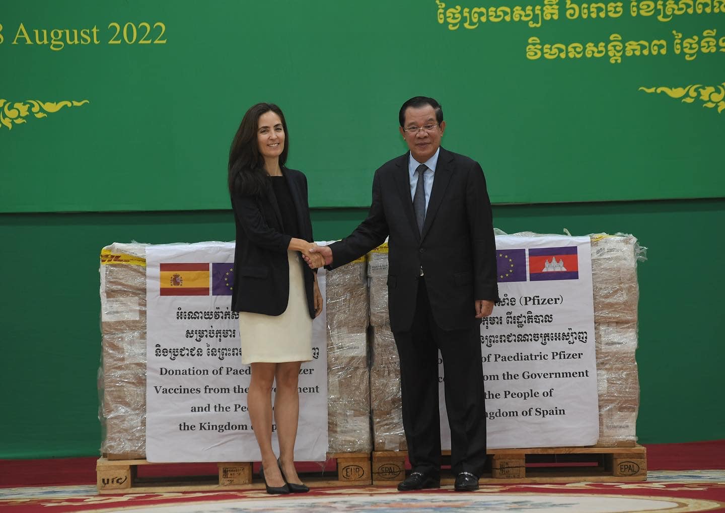 យោងតាមការចុះផ្សាយរបស់ ក្រសួងព័ត៌មាន បានឲ្យដឹងថា សម្តេចអគ្គមហាសេនាបតីតេជោ ហ៊ុន សែន នាយករដ្ឋមន្រ្តី នៃព្រះរាជាណាចក្រកម្ពុជា អញ្ជើញទទួលវ៉ាក់សាំងការពារជំងឺកូវីដ-១៩ Pfizer សម្រាប់កុមារ ចំនួន ៣០ម៉ឺនដូស ដែលជាអំណោយពីប្រជាជន និងរដ្ឋាភិបាល នៃព្រះរាជាណាចក្រអេស៉្បាញ ជូនប្រជាជន និងរាជរដ្ឋាភិបាល នៃព្រះរាជាណាចក្រកម្ពុជា ពីលោកជំទាវ គ្រីស្ទីណា អាហ្គៀឡា (Cristina Aguilar) ភារធារីស្តីទី នៃស្ថានទូតអេស្បាញ ប្រចាំកម្ពុជា នៅវិមានសន្តិភាព រាជធានីភ្នំពេញ នាព្រឹកថ្ងៃទី១៨ ខែសីហា ឆ្នាំ២០២២។