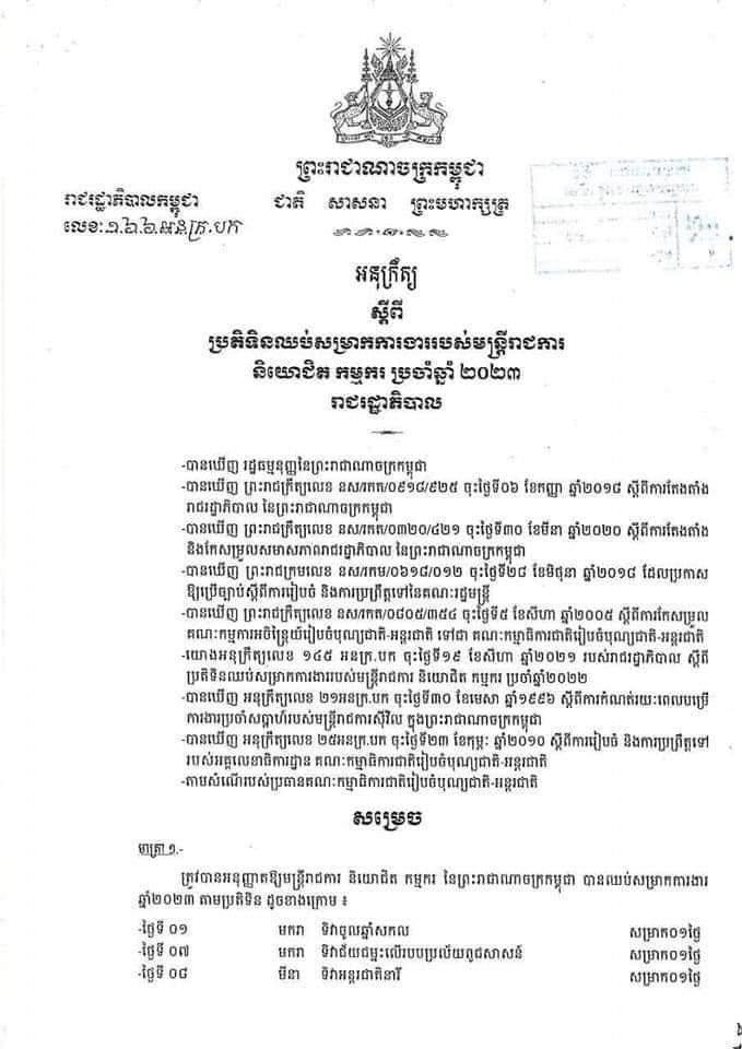 រាជរដ្ឋាភិបាល ចេញអនុក្រឹត្យ ស្តីពីប្រតិទិនឈប់សម្រាកការងាររបស់មន្ត្រីរាជការ និយោជក កម្មករ សម្រាប់ឆ្នាំ២០២៣  ដោយឈប់បាន២១ថ្ងៃ
