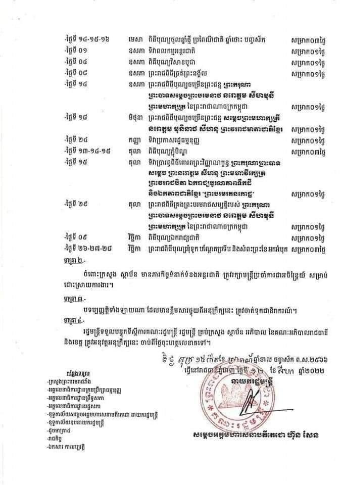 រាជធានីភ្នំពេញ៖ នៅថ្ងៃទី១៩ ខែសីហា ឆ្នាំ២០២២ បានឱ្យដឹងថា សម្តេចតេជោ ហ៊ុន សែន នាយករដ្ឋមន្ត្រីនៃកម្ពុជា បានចេញអនុក្រឹត្យ ស្ដីពី ប្រតិទិនឈប់សម្រាកការងាររបស់មន្ត្រីរាជការ និយោជិត កម្មករ ប្រចាំឆ្នាំ២០២៣។