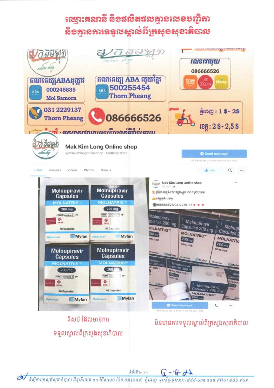 ក្រសួងសុខាភិបាល ហាមឃាត់ម្ចាស់គណនីហ្វេសប៊ុកមួយ លក់ឱសថព្យាបាលកូវីដ-១៩ MOLNUPIRAVIR ដែលគ្មានការទទួលស្គាល់ពីក្រសួង