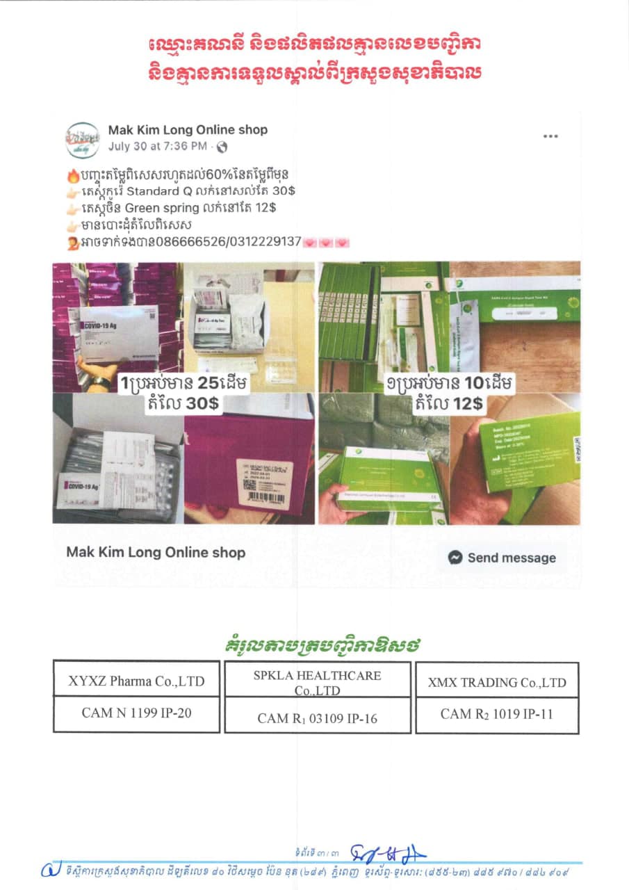 យោងតាមការពិនិត្យឃើញលើបណ្ដាញសង្គមហ្វេសប៊ុកមានគណនីឈ្មោះ Mak Kim Long Online Shop កំពុងផ្សព្វផ្សាយលក់ឱសថ MOLNUPIRAVIR(MOALNATRIS) គ្មានលេខបញ្ជិកា ដូចមានភ្ជាប់ក្នុងរូបភាពមកជាមួយ ព្រមទាំងមានលក់តេស្តរហ័សរកវីរុសកូវីដ-១៩ មួយចំនួនទៀតផងដែរ។