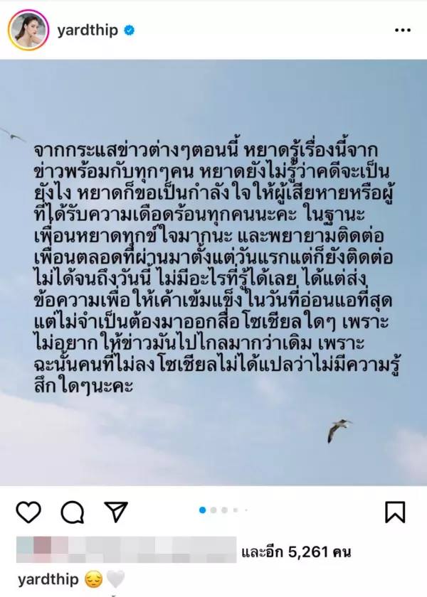 ថ្មីៗនេះដែរតារាស្រី Yatthip Ratchapal បានបង្ហោះសារមួយចេញមក ជុំវិញបញ្ហានេះ ដោយរៀបរាប់ថា « Yatt បានដឹងព័ត៌មានដែលបានកើតឡើងដំណាលអ្នករាល់គ្នាតែម្តង ខណៈពេលនេះដែរ Yatt ក៏នៅមិនទាន់ដឹងថាដំណើររឿងនៃក្តីក្តាំងនឹងដើរទៅបែបណានោះទេ នាងក៏បានលើកទឹកចិត្តដល់ជនរងគ្រោះ ឬអ្នកដែលបានរងទុក្ខទាំងអស់គ្នានៅទីនេះ ហើយក្នុងនាមជាមិត្តភក្តិ នាងពិតជាកើតទុក្ខខ្លាំងណាស់ដែរ ហើយព្យាយាមទាក់ទងទៅកាន់មិត្តភក្តិគ្រប់ពេលតាំងពីថ្ងៃដំបូង ប៉ុន្តែនៅមិនអាចទាក់ទងបានរហូតមកដល់ថ្ងៃនេះ។