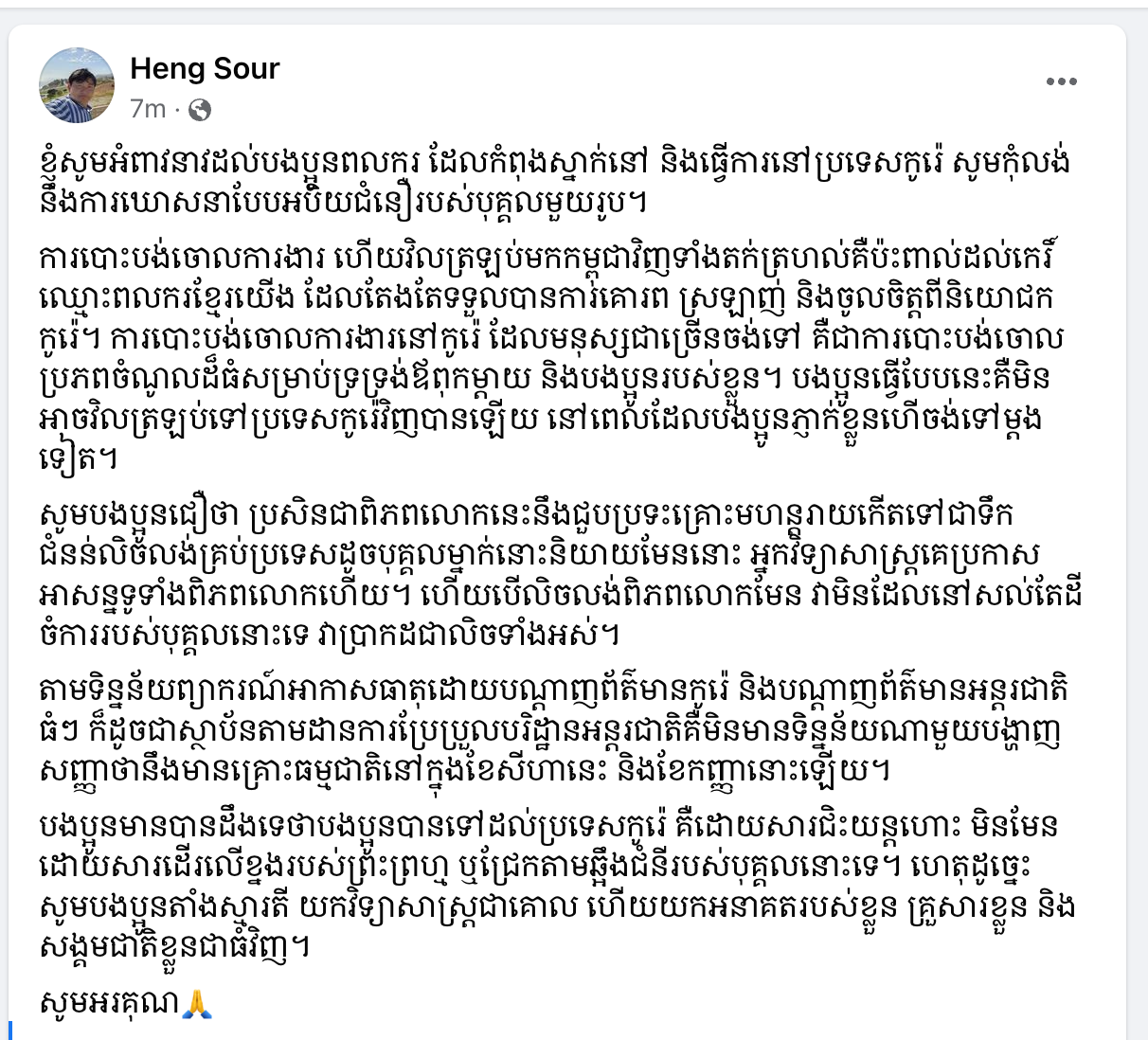 នៅក្នុងគណនីហ្វេសប៊ុករបស់ លោក ហេង សួរ បា​នសរសេររៀបរាប់ថា៖ ខ្ញុំសូមអំពាវនាវដល់បងប្អូនពលករ ដែលកំពុងស្នាក់នៅ និងធ្វើការនៅប្រទេសកូរ៉េ សូមកុំលង់នឹងការឃោសនាបែបអបិយជំនឿរបស់បុគ្គលមួយរូប។