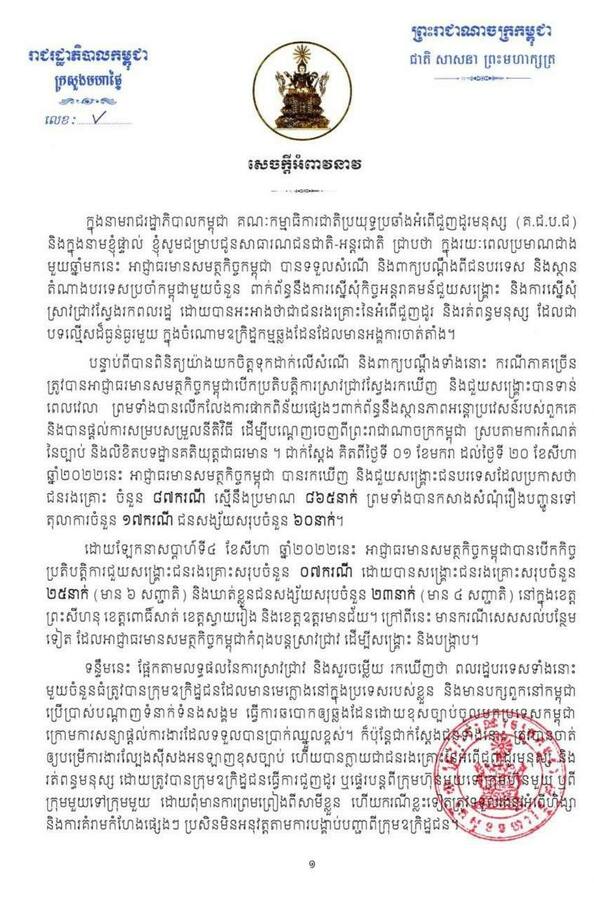 ជាក់ស្ដែង គិតពីថ្ងៃទី០១ ខែមករា ដល់ថ្ងៃទី២០ ខែសីហា ឆ្នាំ២០២២នេះ អាជ្ញាធរមានសមត្ថកិច្ចកម្ពុជា បានរកឃើញ និងជួយសង្គ្រោះជនបរទេស ដែលប្រកាសថា ជនរងគ្រោះ ចំនួន ៨៧ករណី ស្មើនឹងប្រមាណ ៨៦៥នាក់ ព្រមទាំងបានកសាងសំណុំរឿងបញ្ចូនទៅតុលាការចំនួន ១៧ករណី ជនសង្ស័យសរុបចំនួន ៦០នាក់ ៕