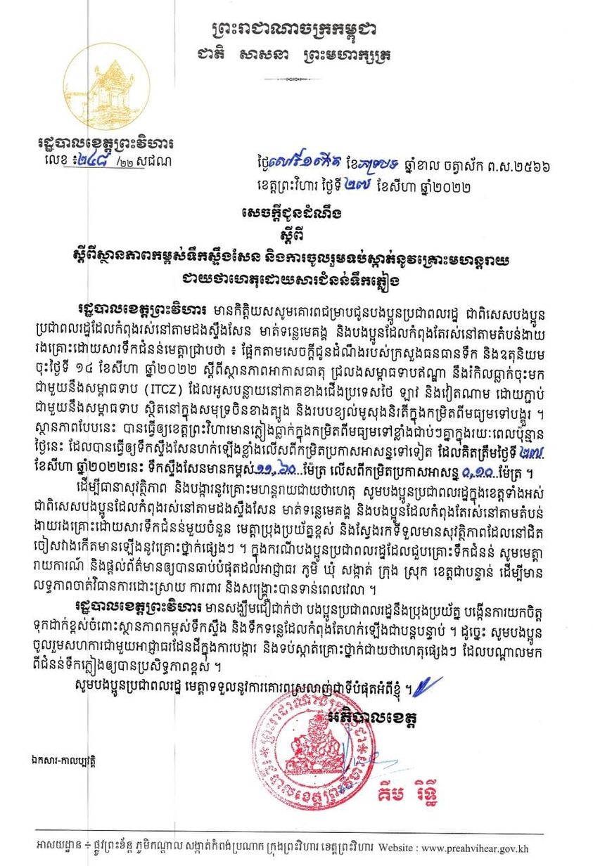 ខេត្តព្រះវិហារ៖ យោងតាមការចុះផ្សាយរបស់ រដ្ឋបាលខេត្តព្រះវិហារ នៅថ្ងៃទី២៧ ខែសីហា ឆ្នាំ២០២២ បានចេញសេចក្ដីជូនដំណឹង សូមជម្រាបជូនបងប្អូនប្រជាពលរដ្ឋដែលកំពុងរស់នៅតាមដងស្ទឹងសែនមាត់ទន្លេមេគង្គ និងបងប្អូនដែលកំពុងរស់នៅតំបន់ងាយរងគ្រោះដោយទឹកជំនន់ មេត្តាជ្រាបថា៖