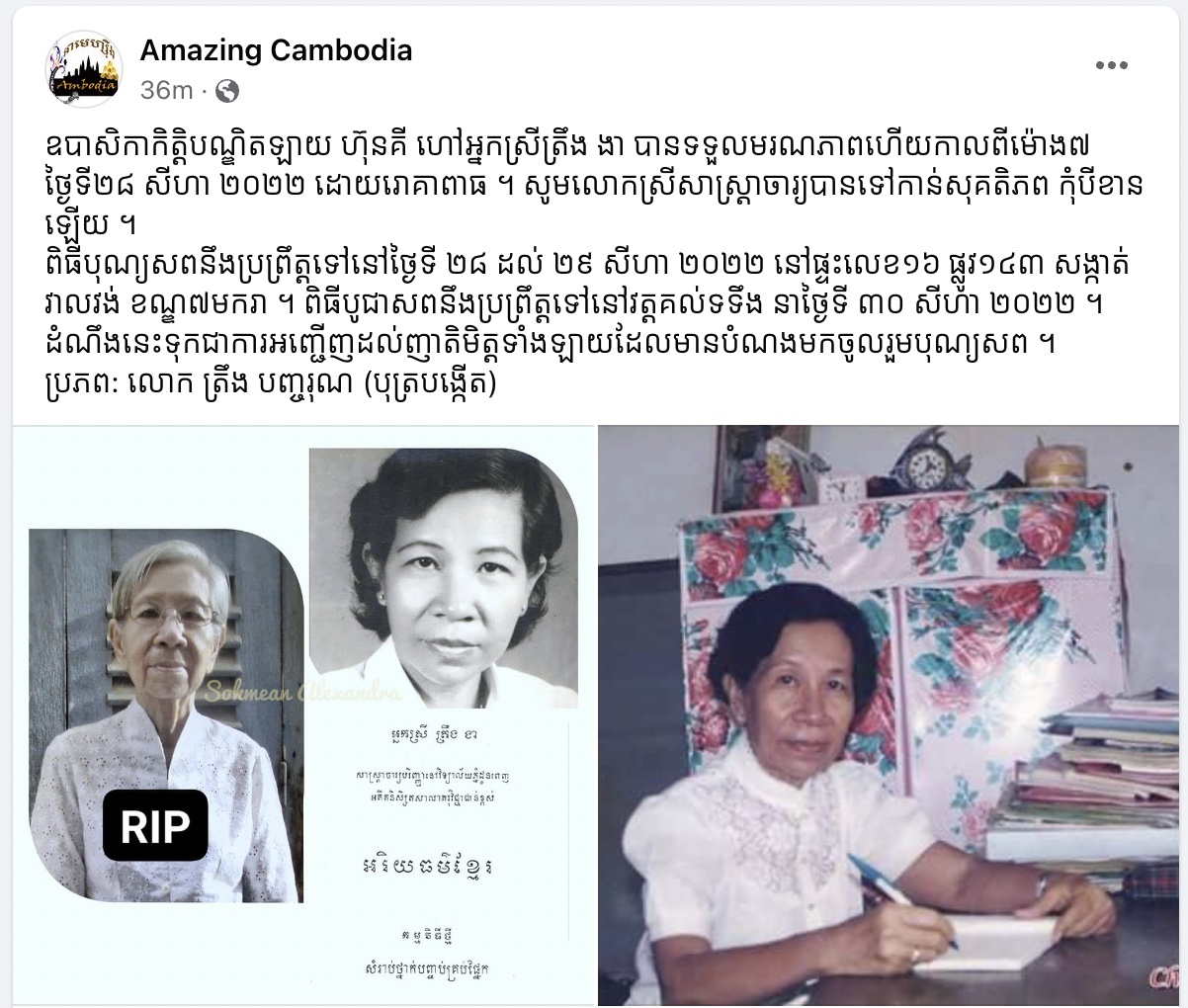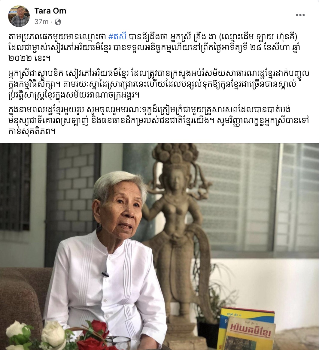សូមចូលរួមរំលែកទុក្ខ! អ្នកស្រី ត្រឹង ងា (ឈ្មោះដើម ឡាយ ហ៊ុនគី) ដែលជាស្ថាបនិកសៀវភៅ «អរិយធម៌ខ្មែរ» បានទទួលអនិច្ចកម្មហើយកាលពីព្រឹកមិញនេះ