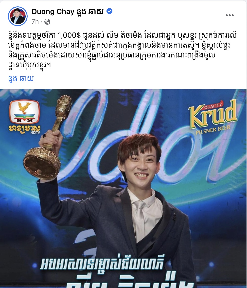 លោក ឌួង ឆាយ ប្រកាសឧបត្ថម្ភថវិកា ១ពាន់ដុល្លារ ដល់ លីម តិចម៉េង ដែលឈ្នះជ័យលាភី Cambodian Idol រដូវកាលទី៤
