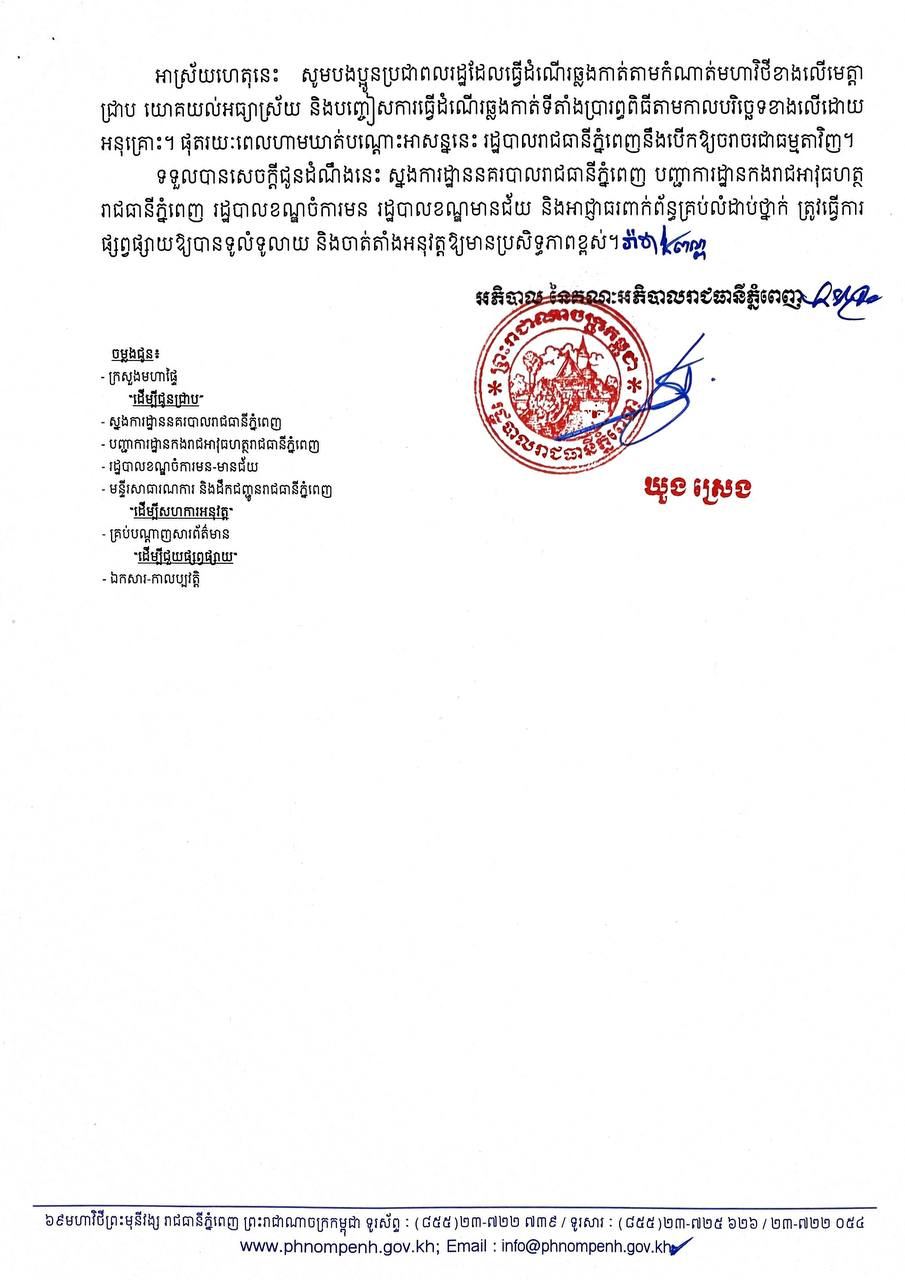 រដ្ឋបាលរាជធានីភ្នំពេញ ប្រកាសផ្អាកការធ្វើដំណើរឆ្លងកាត់កំណាត់ផ្លូវ ៦០ម៉ែត្ររយៈពេល ៣ថ្ងៃ ដើម្បីរៀបចំពិធីបើកការដ្ឋានសាងសង់ស្ពានអាកាស