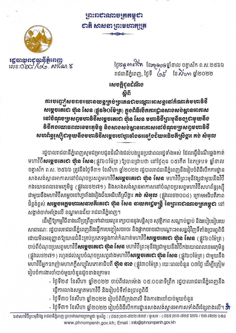 ដើម្បីឱ្យកម្មវិធីខាងលើ ប្រព្រឹត្តទៅដោយរលូន រក្សាបាននូវសន្តិសុខ សុវត្ថិភាព សណ្ដាប់ធ្នាប់ និងរបៀបរៀបរយសារធារណៈ រដ្ឋបាលរាជធានីភ្នំពេញ នឹងធ្វើការបញ្ចៀសចរាចរ និងផ្អាកចរាចរជាបណ្ដោះអាសន្នជុំវិញទីតាំងប្រារព្ធ ដោយមិនអនុញ្ញាតឱ្យយានជំនិះគ្រប់ប្រភេទឆ្លងកាត់ កំណាត់មហាវិថី សម្តេចតេជោ ហ៊ុន សែន (ផ្លូវ ៦០ម៉ែត្រ) រយៈពេល ០៣ថ្ងៃ ដើម្បីត្រៀមរៀបចំការងារចាំបាច់មួយចំនួនដូចខាងក្រោម៖