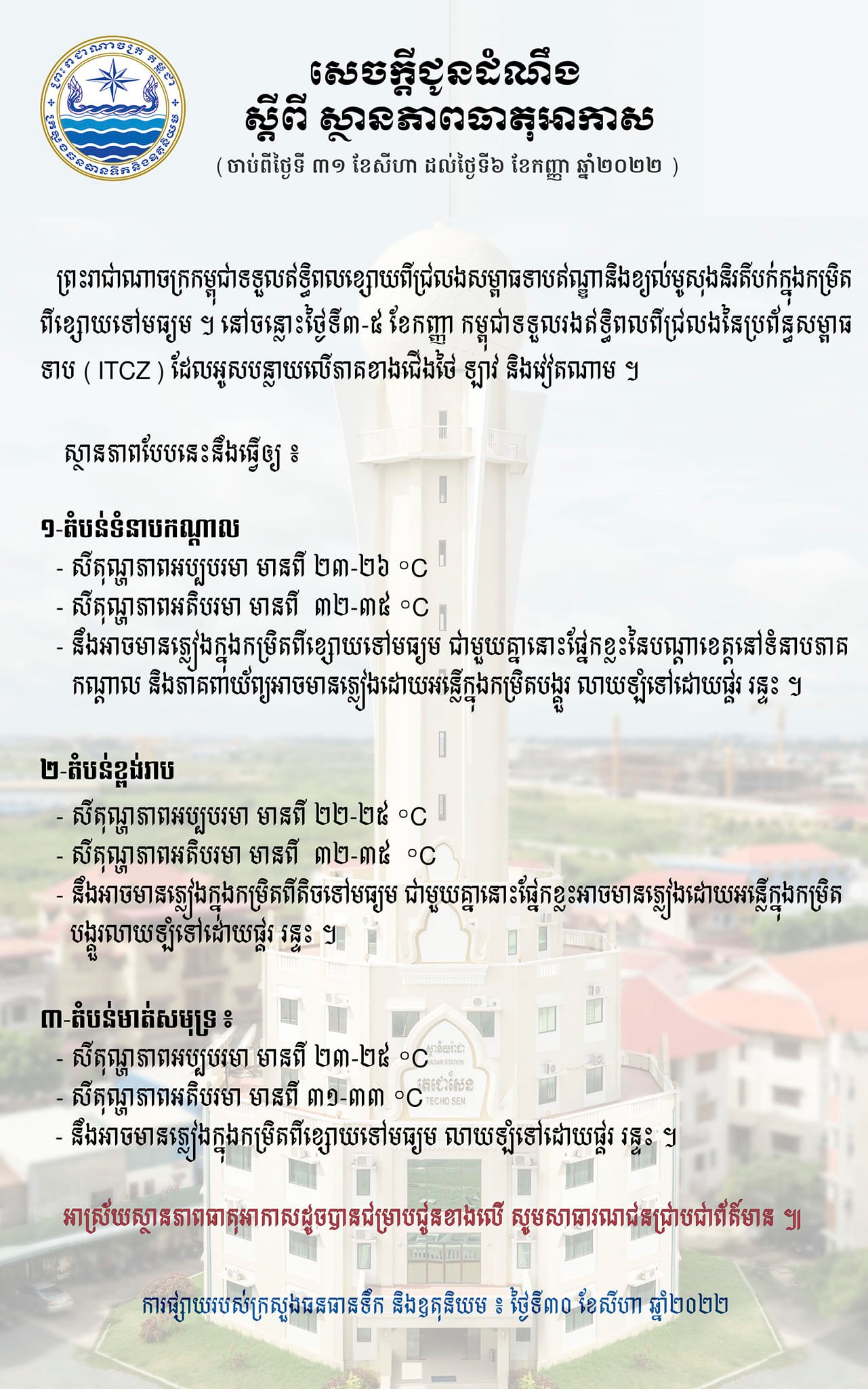 រាជធានីភ្នំពេញ៖ យោងតាមការចុះផ្សយារបស់ ក្រសួងធនធានទឹក និងឧតុនិយម នៅថ្ងៃទី៣០ ខែសីហា ឆ្នាំ២០២២ បានចេញសេចក្ដីជូនដំណឹងស្ដីពី ស្ថានភាពធាតុអាកាស ចាប់ពីថ្ងៃទី៣១ ខែសីហា ដល់ថ្ងៃទី០៦ ខែកញ្ញា ឆ្នាំ២០២២ បានឱ្យជ្រាបថា៖