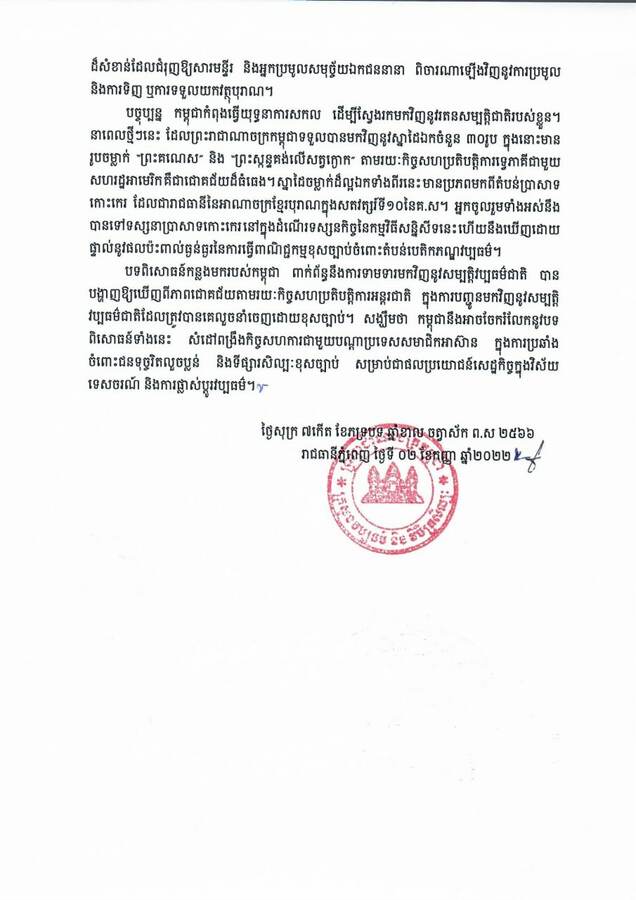 នៅថ្ងៃទី៧ ខែកញ្ញា ឆ្នាំ ២០២២ លោកជំទាវបណ្ឌិត សភាចារ្យ ភឿង សកុណា រដ្ឋមន្ត្រីក្រសួងវប្បធម៌ និងវិចិត្រសិល្បៈ នឹងធ្វើជាប្រធាននៃកិច្ចប្រជុំពេញអង្គអន្តរជាតិ និងកិច្ចប្រជុំថ្នាក់រដ្ឋមន្ត្រីវប្បធម៌មកពីសមាគមប្រជាជាតិអាស៊ីអាគ្នេយ៍ (អាស៊ាន)។ វេទិកាជាប្រវត្តិសាស្ត្រនេះ ក៏នឹងពិនិត្យពិភាក្សាលើមធ្យោបាយនានាក្នុងក្របខណ្ឌអាស៊ាន សំដៅទប់ទល់នឹងបញ្ហាឆ្លងកាត់ព្រំដែននេះ។