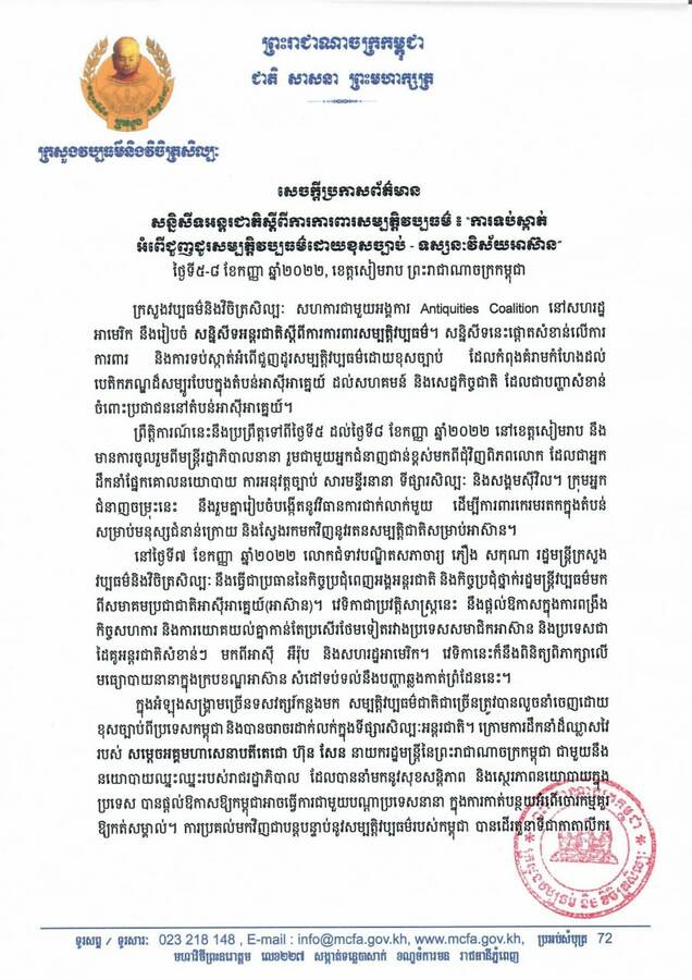 ក្រសួងវប្បធម៌សហការជាមួយអង្គការ Antiquities Coalition នឹងរៀបចំសន្និសីទអន្តរជាតិស្តីពីការការពារសម្បត្តិវប្បធម៌ចាប់ពីថ្ងៃទី៥ ដល់៨ ខែកញ្ញា ឆ្នាំ២០២២ នៅខេត្តសៀមរាប
