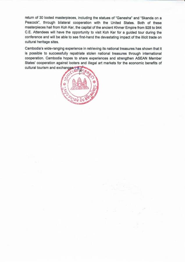 សង្ឃឹមថា កម្ពុជានឹងអាចចែករំលែកនូវបទ ពិសោធន៍ទាំងនេះ សំដៅពង្រឹងកិច្ចសហការជាមួយបណ្តាប្រទេសសមាជិកអាស៊ាន ក្នុងការប្រឆាំងចំពោះជនទុច្ចរិតលួចប្លន់ និងទីផ្សារសិល្បៈខុសច្បាប់ សម្រាប់ជាផលប្រយោជន៍សេដ្ឋកិច្ចក្នុងវិស័យទេសចរណ៍ និងការផ្លាស់ប្តូរវប្បធម៌៕
